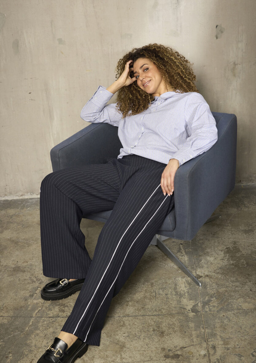 Den blå skjorte med hvide striber er med krave, lange ærmer med manchet luk og flot runding med slids i siderne.