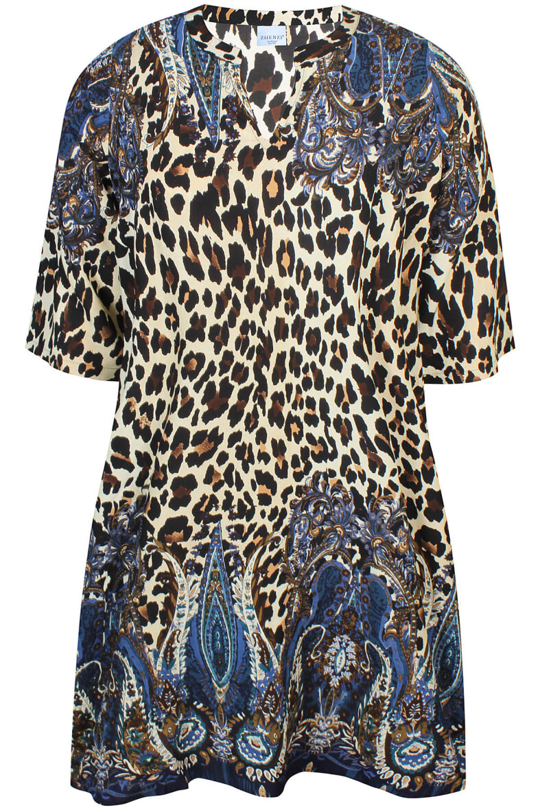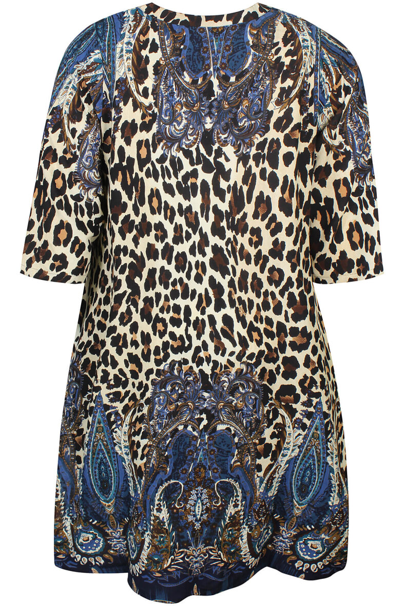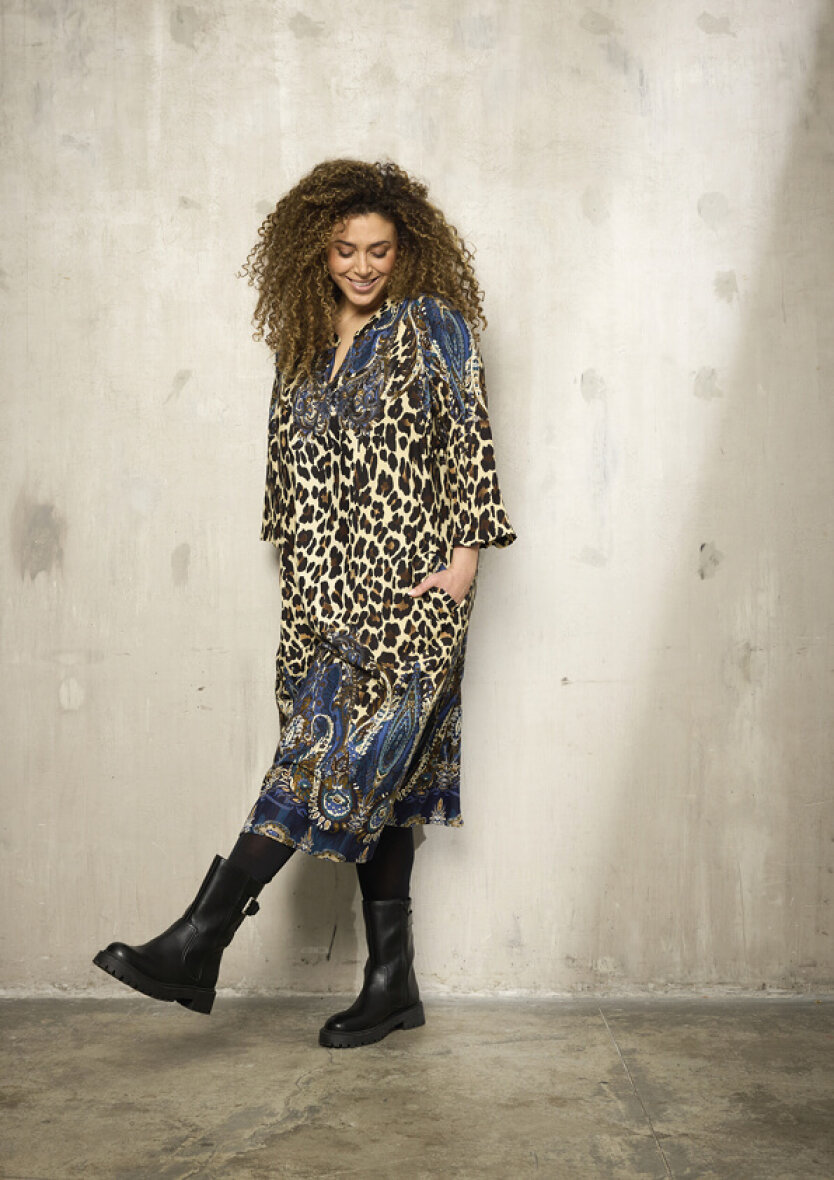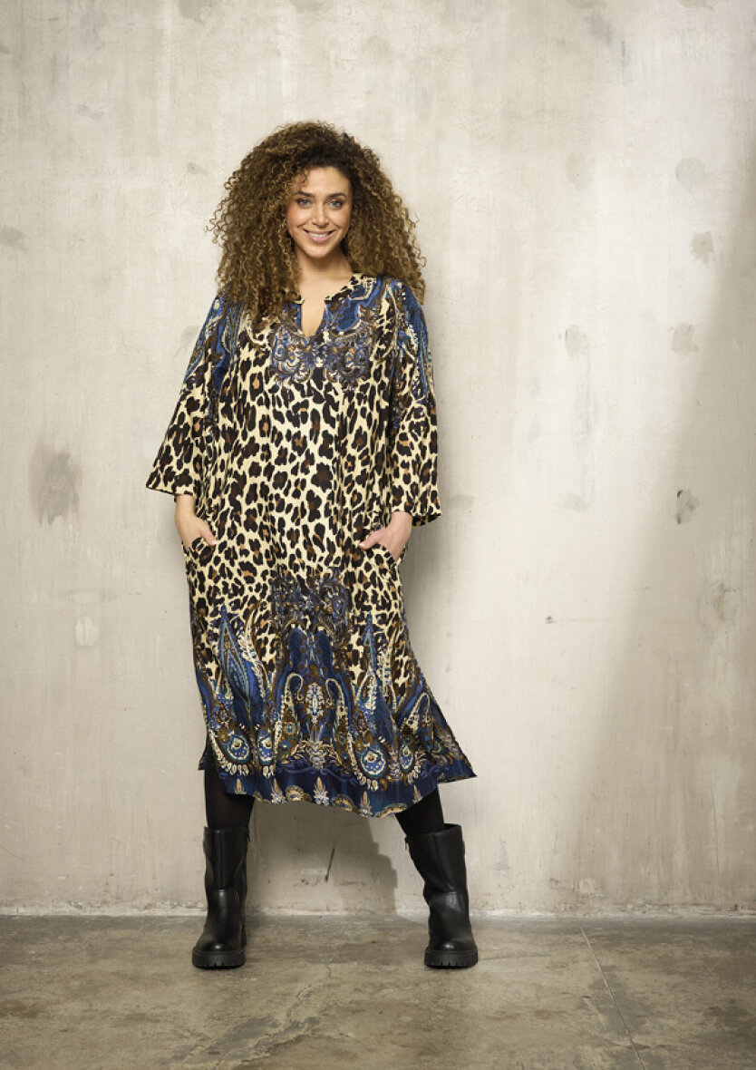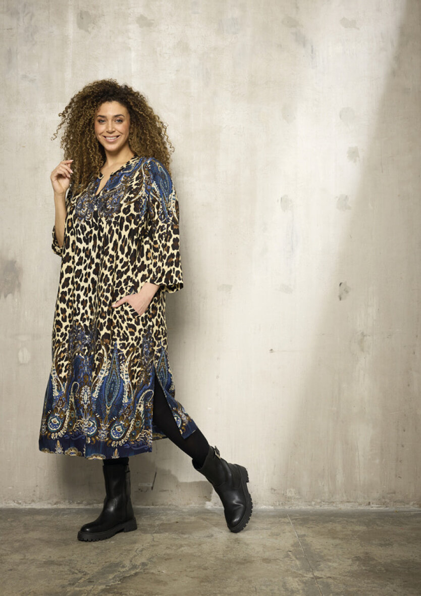 Flot lang kjole fra Zhenzi. Kjolen er lavet i et skønt mix af prints med leopard print på midten og blå og brunt mønster i den øverste og nederste del af kjolen, som giver et fedt pift til designet.