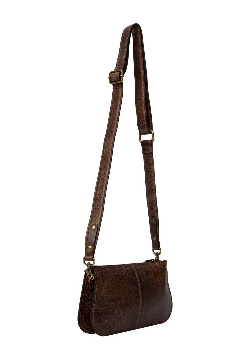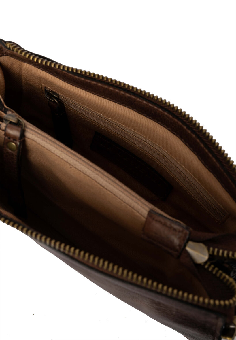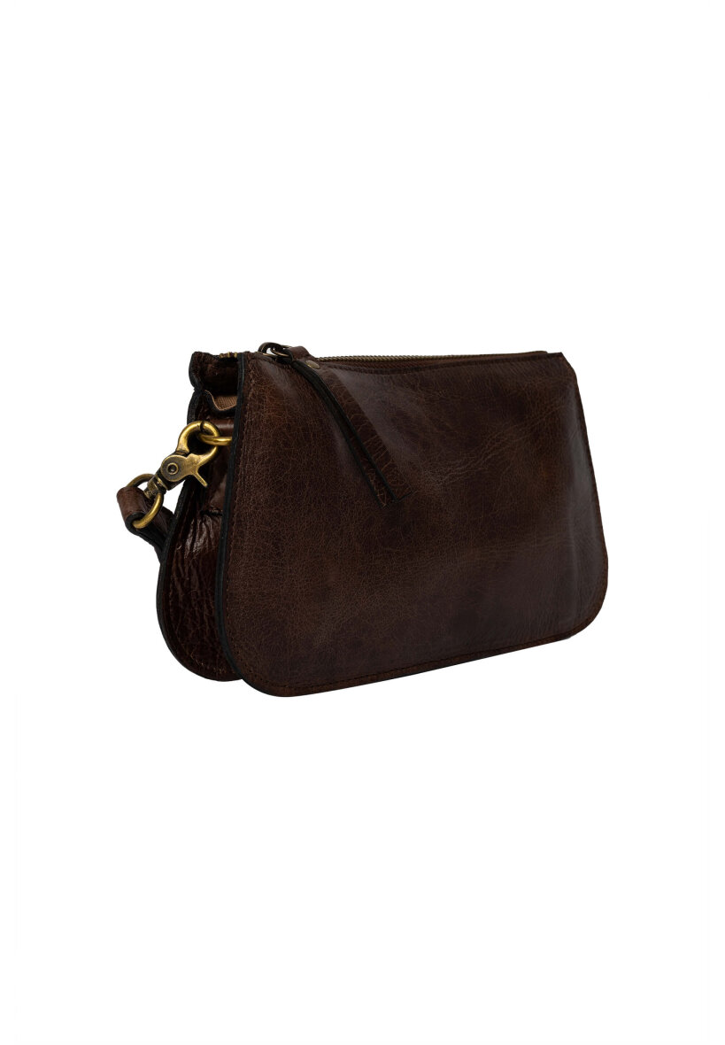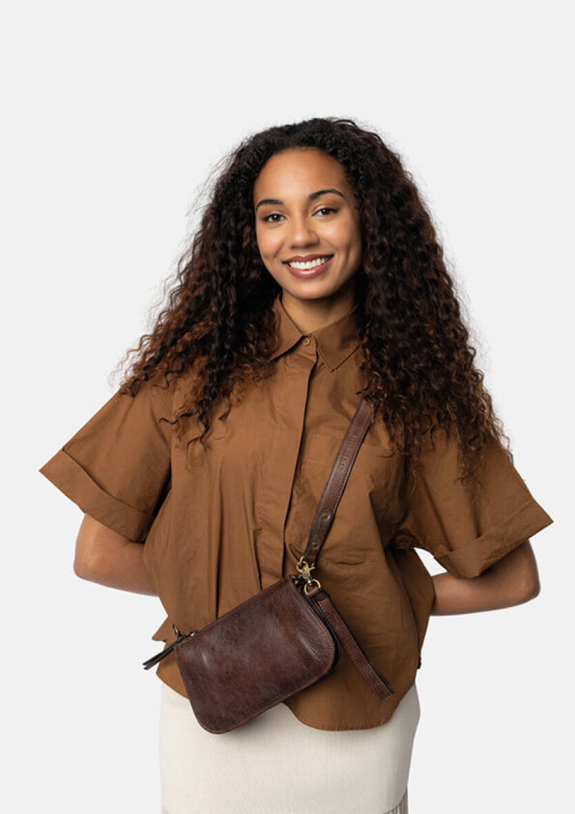 Re:Designed taske i modellen Myn - Small. Tasken er lavet i den fineste mørkebrune farve (woodsmoke). Myn Small er en alsidig og elegant lædertaske, der kan bæres både som clutch og som crossbody, med den aftagelige håndledsrem og den medfølgende justerbare crossover-rem. På trods af sin kompakte størrelse rummer tasken mere, end man skulle tro.