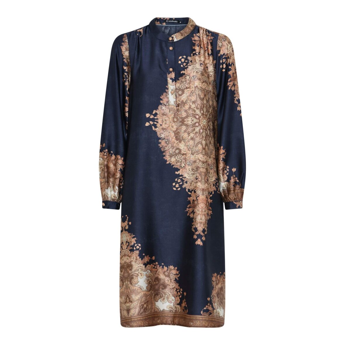 Smuk Soulmate kjole i en silkeblød 100% polyester kvalitet. Den mørkeblå kjole er med et smukt mønster i brune og beige nuancer.