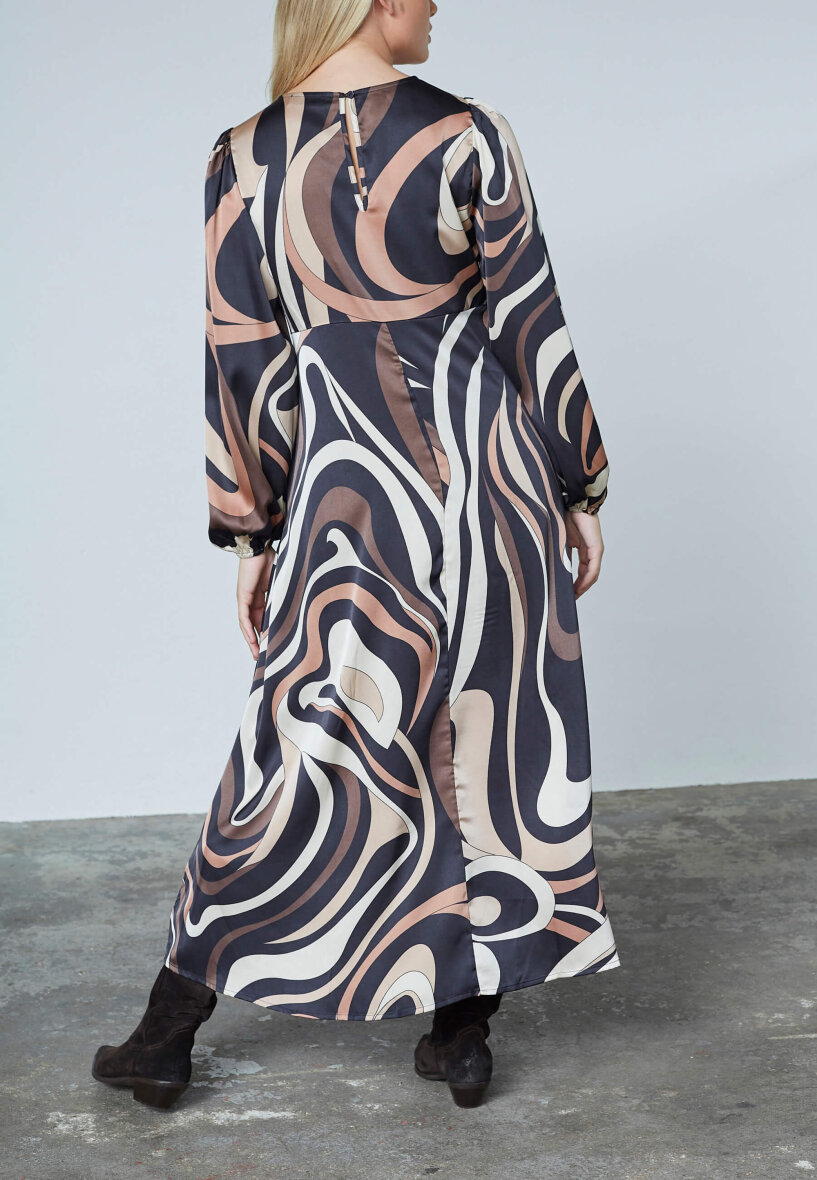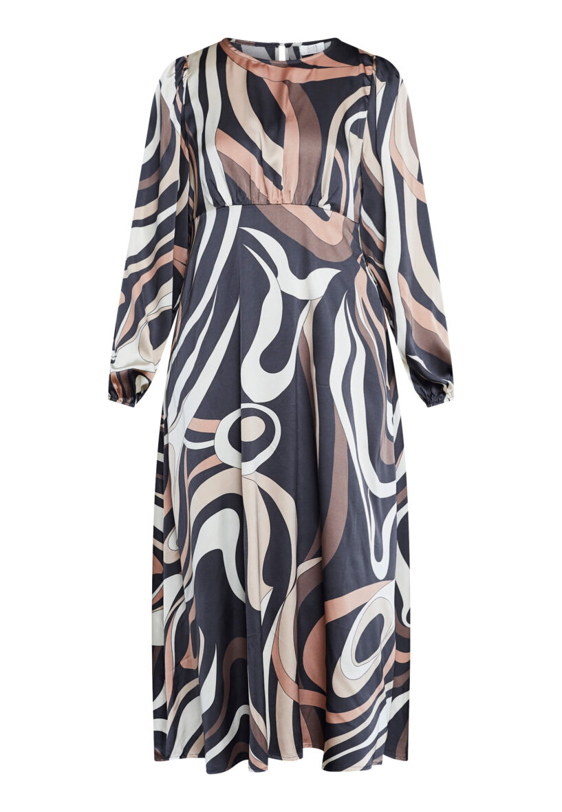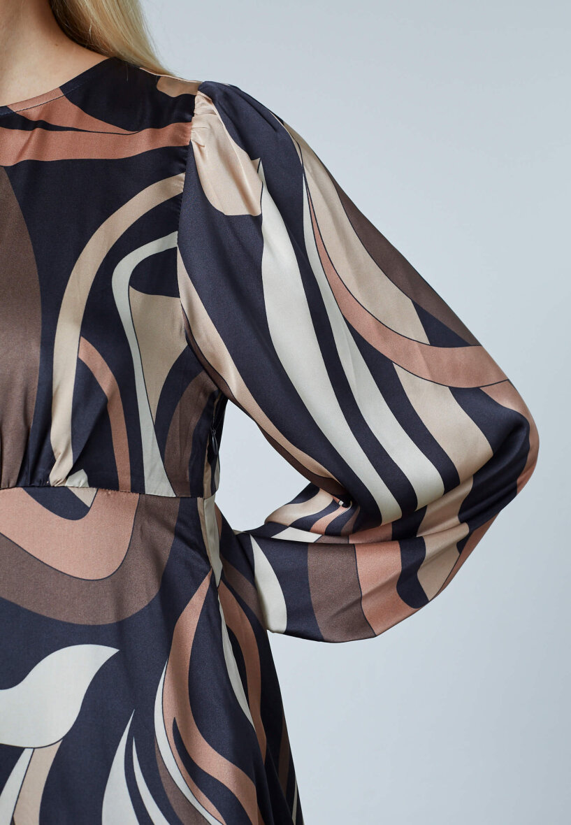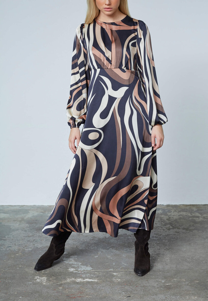 Love & Divine kjole i et flot grafisk print i brune, beige og sorte nuancer.