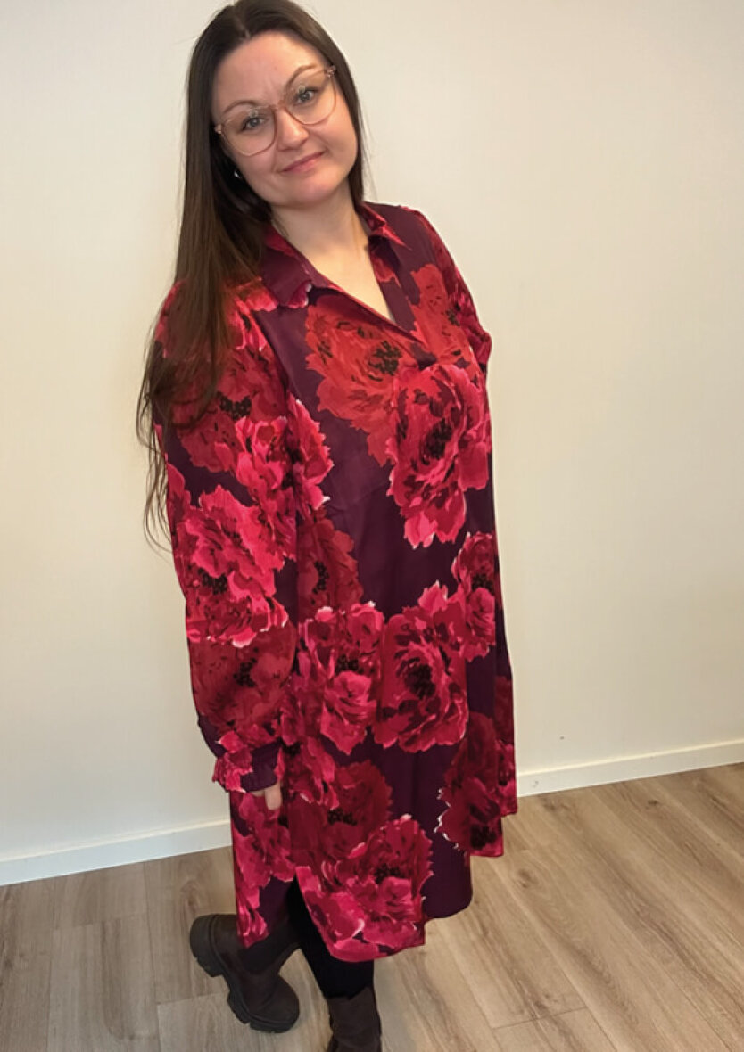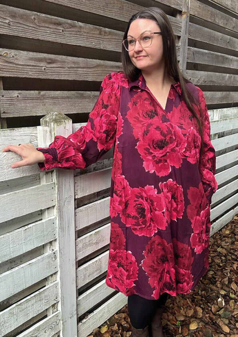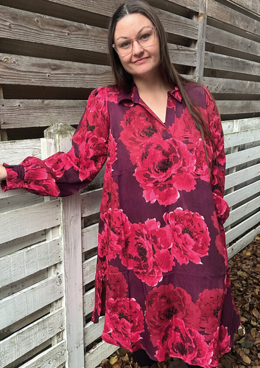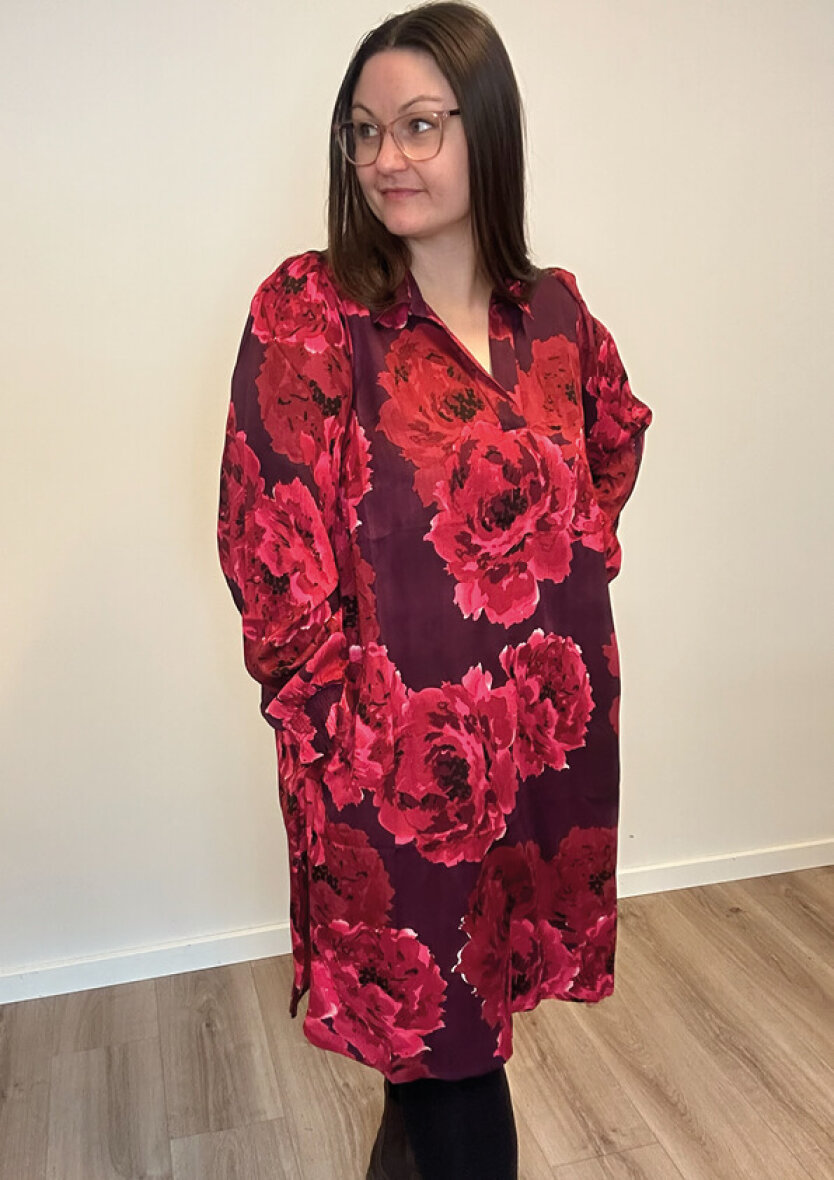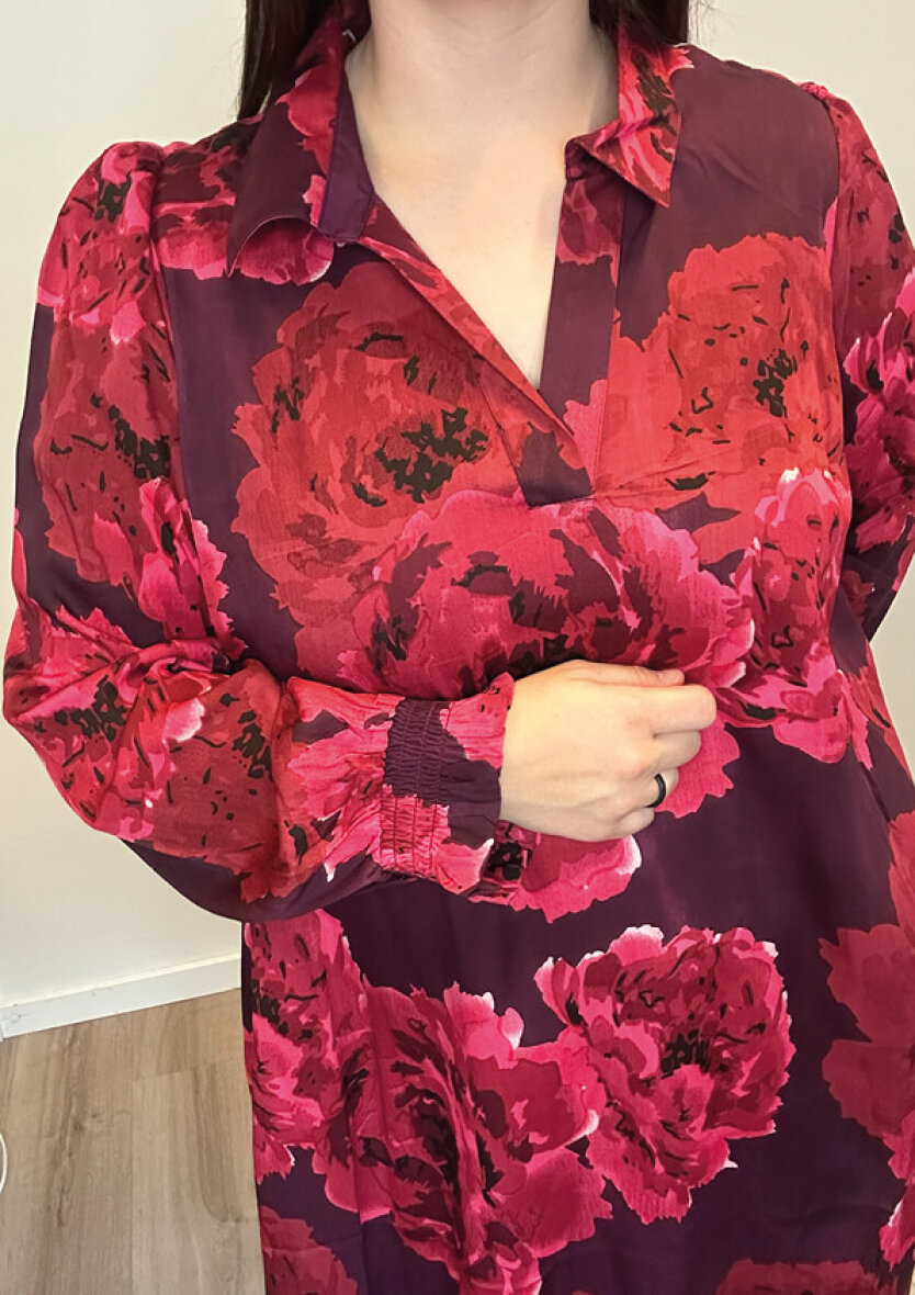Zhenzi kjole i et flot og farverigt blomsterprint i røde nuancer og mørklilla base. Kjolen er med krave og v-halsudskæring. De lange ærmer afsluttes med smock og flæse kant.