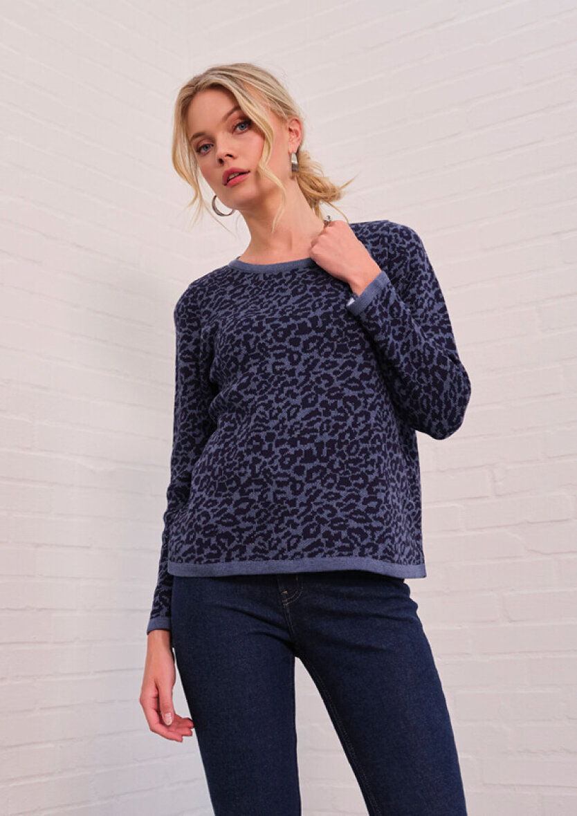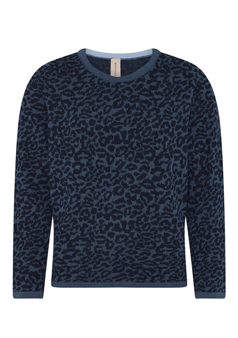 Skovhuus striktrøje i et flot og moderne leopard mønster i blå nuancer.