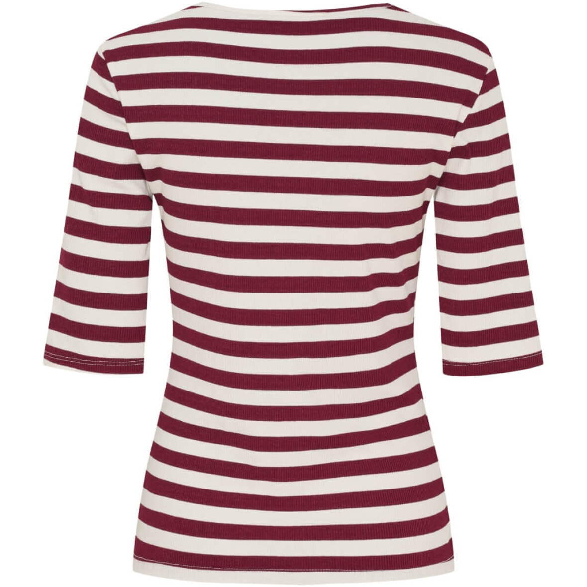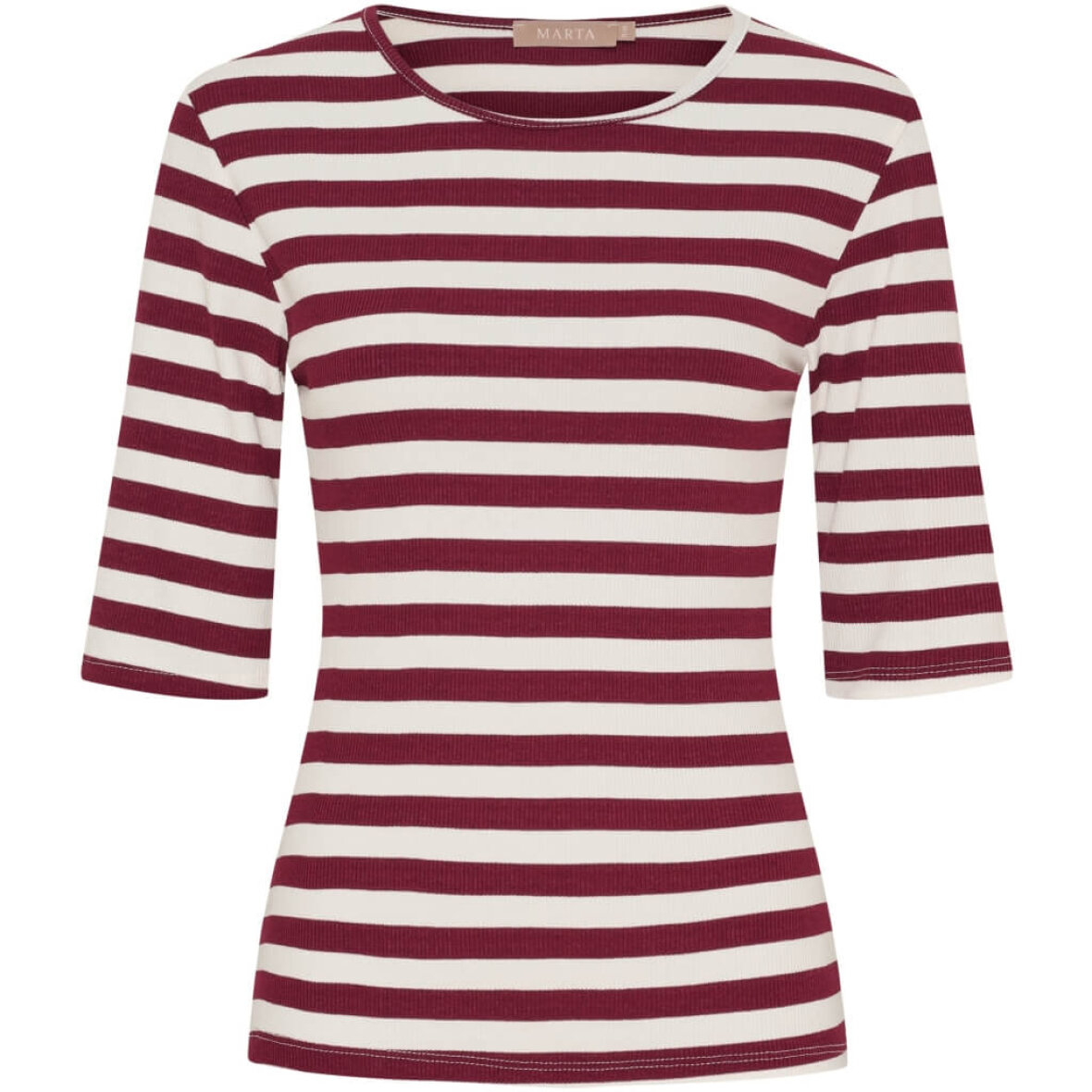 Blusen er med rund hals og 2/4 ærmer. Blusen er lavet i en lækker viskose kvalitet med stræk og ribbet materiale, som giver en tætsiddende pasform.