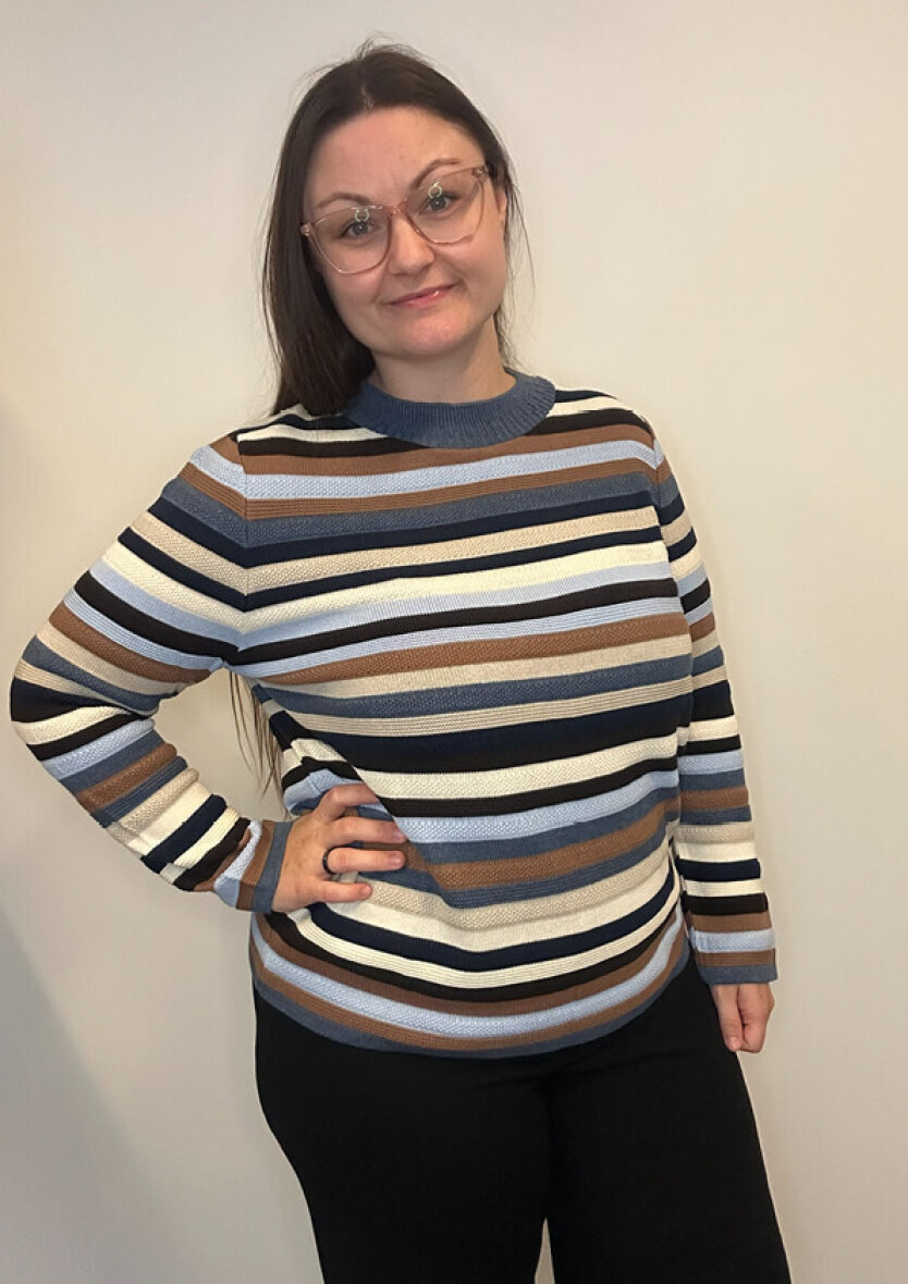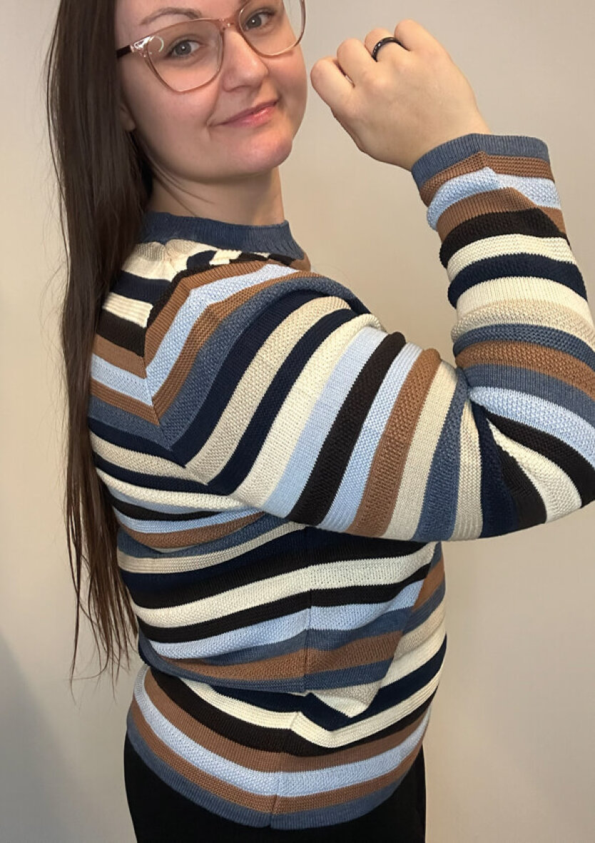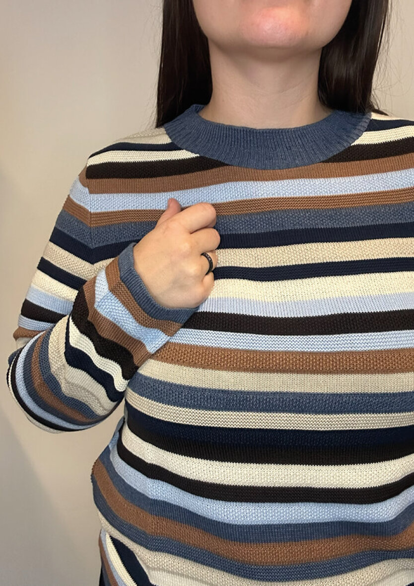 Trøjen er med rund hals, lange ærmer samt ribkant ved alle åbninger. Striktrøjen er lavet i en dejlig blød kvalitet i en bomuldsblanding, som er særdeles behagelig at have på.