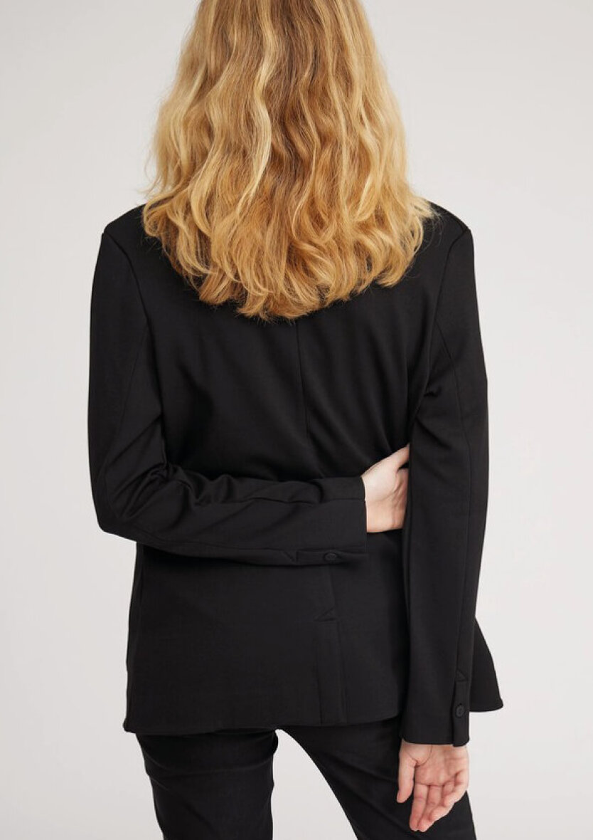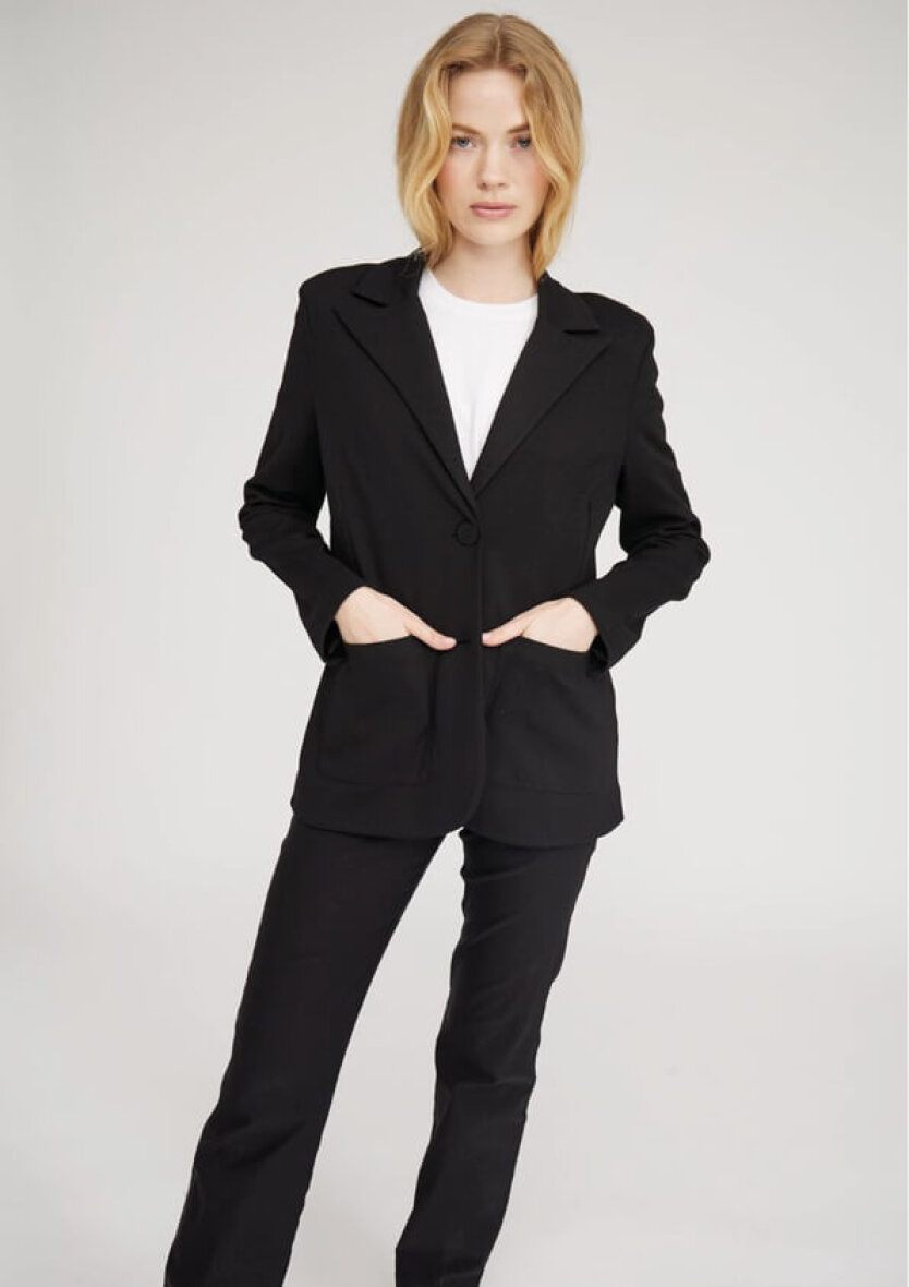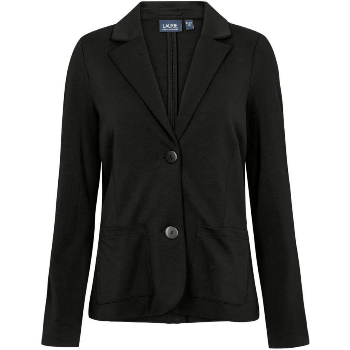 Laurie blazer en sort klassisk farve og tidsløst design. Blød og komfortabel blazer med klassisk krave, flot revers og knaplukning foran. Blazeren har lange ærmer og er designet med fine, påsyede lommer på fronten, som tilføjer et afslappet og moderne udtryk. Den lette kvalitet gør den behagelig at have på hele dagen, og snittet gør den nem at style til både hverdag og mere formelle anledninger.