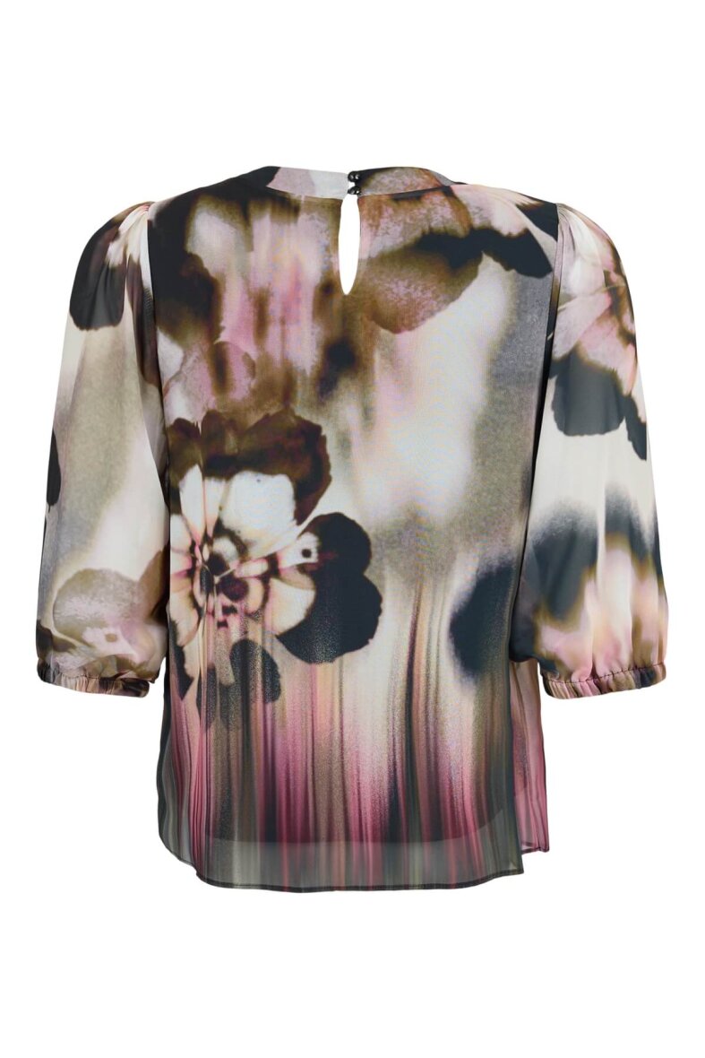 Molly-Jo bluse i et elegant grafisk blomsterprint i et mix af vinrød, rosa og grønne nuancer. Blusen er lavet i 100% polyester og giver med det lette stof et feminint og sofistikeret udtryk. Kroppen er foret med sort påsyet top for ekstra komfort og diskretion, mens de 3/4 lange, uforede ærmer skaber en let og sofistikeret kontrast. Ærmer afsluttes med elastikkant, hvilket skaber en flot poset effekt.