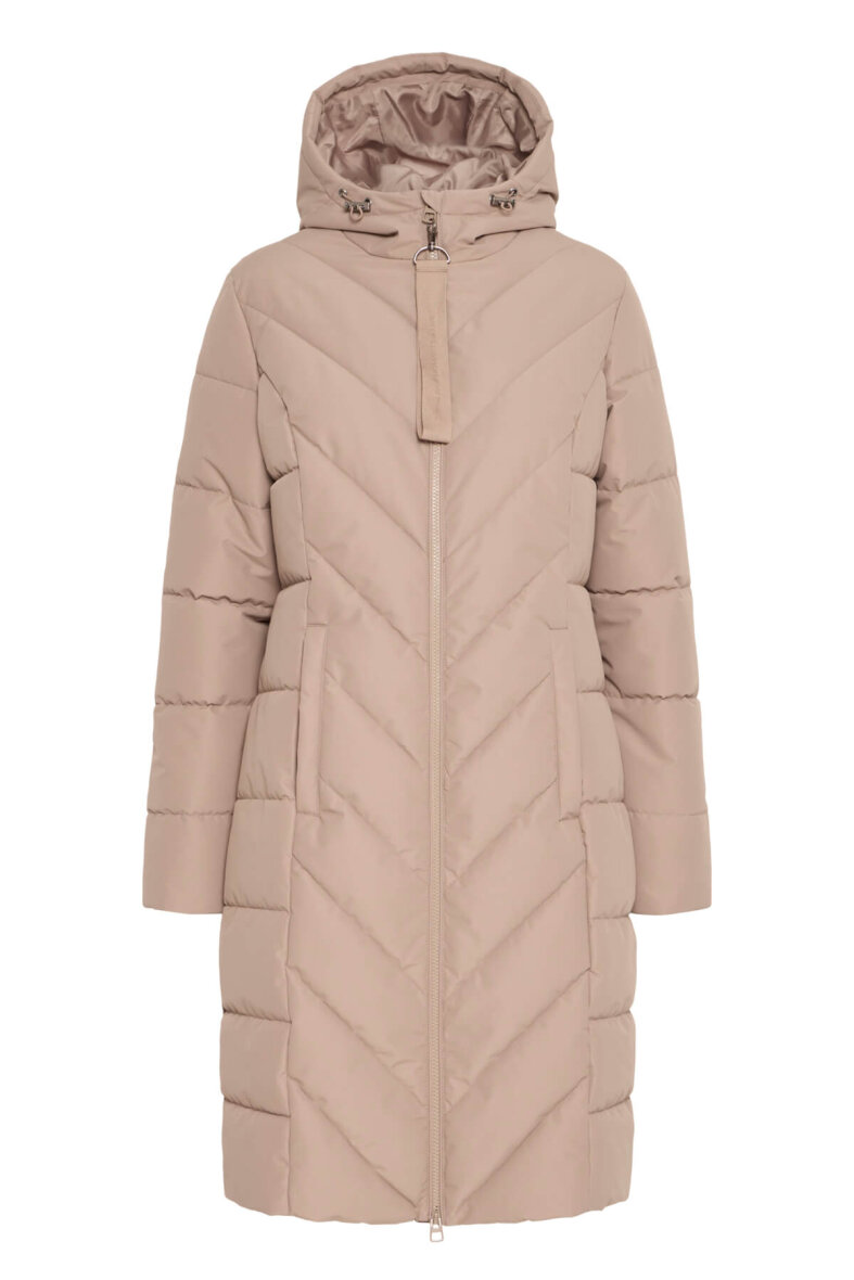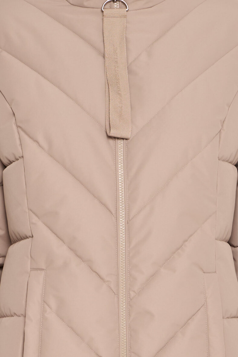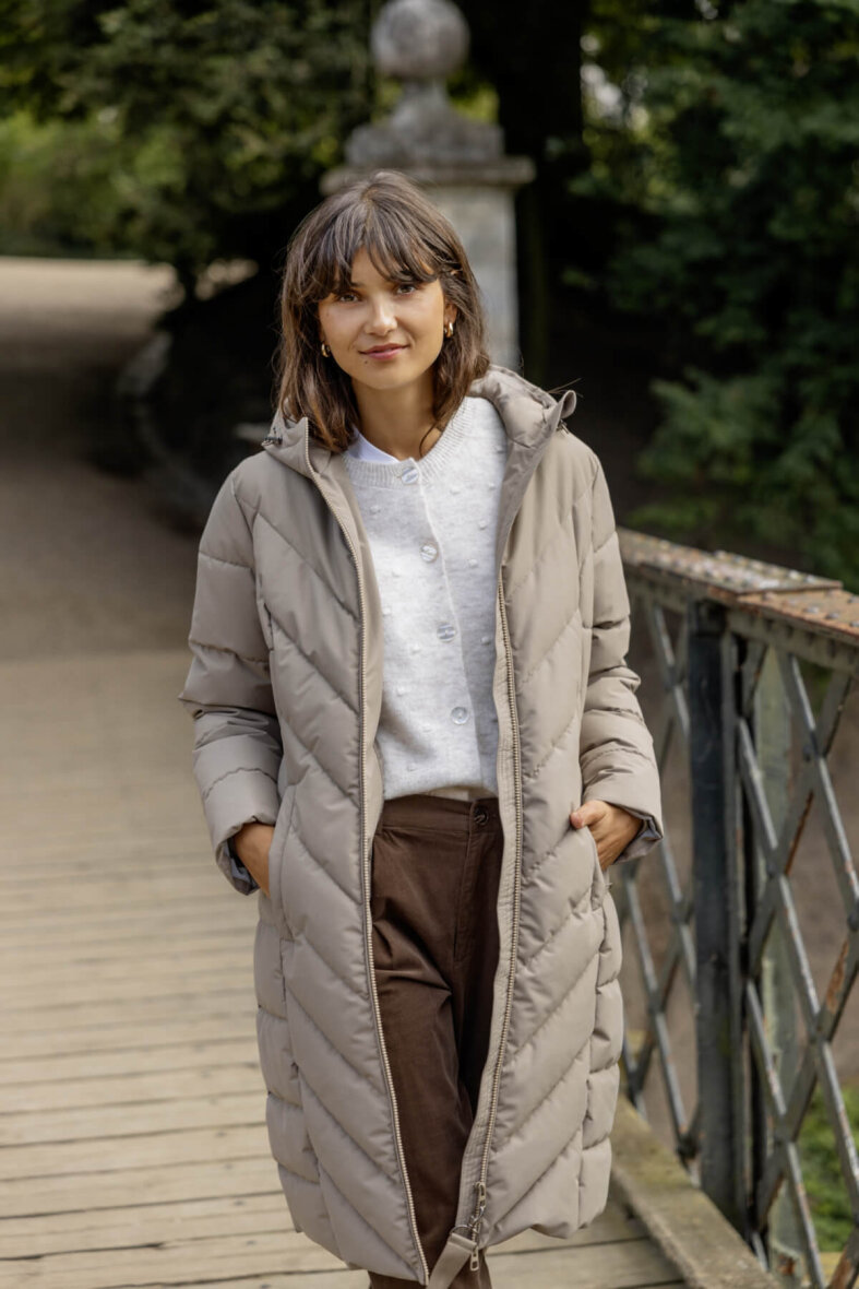 FRANSA jakke i en flot lysebrun farve (Taupe). Denne lange dunjakke er designet med en klassisk pasform og vandret quiltning, der sikrer både komfort og effektiv varmeisolering.