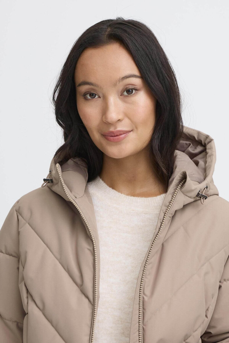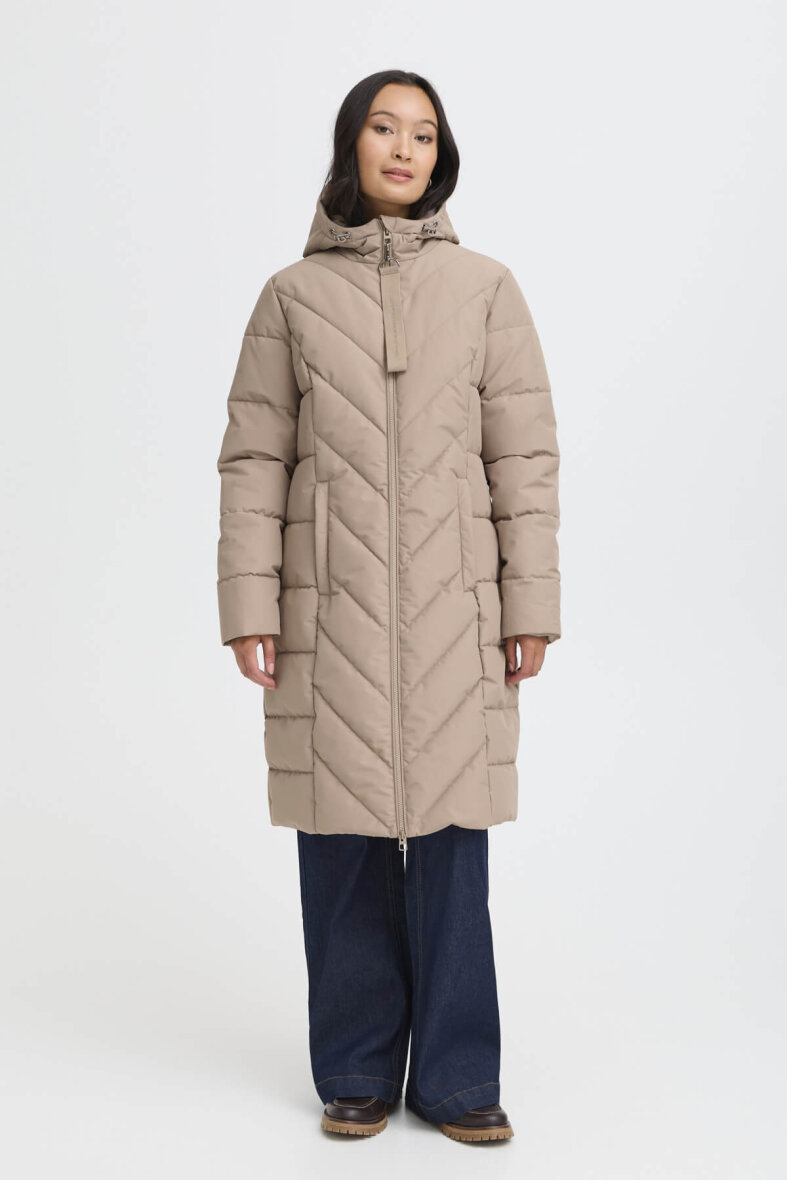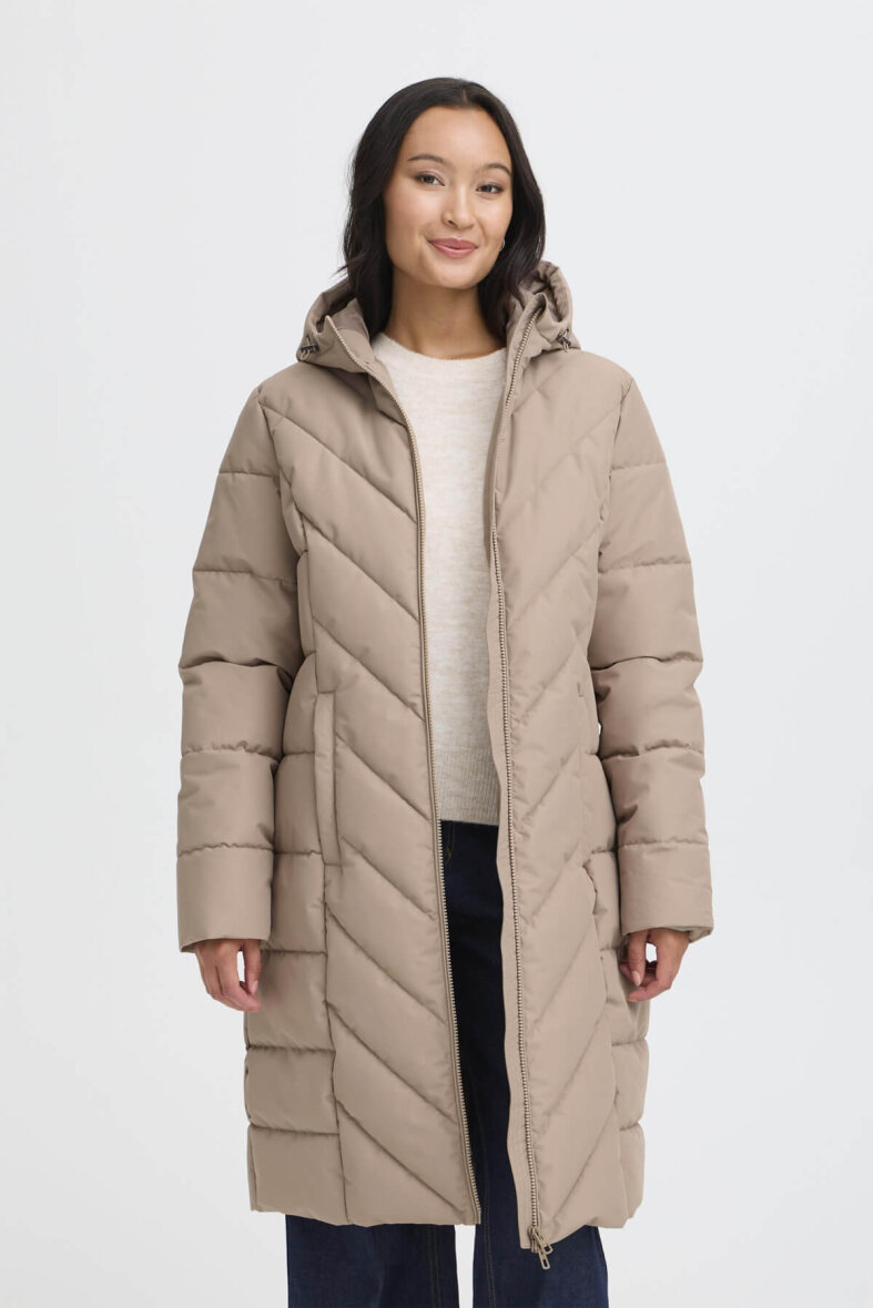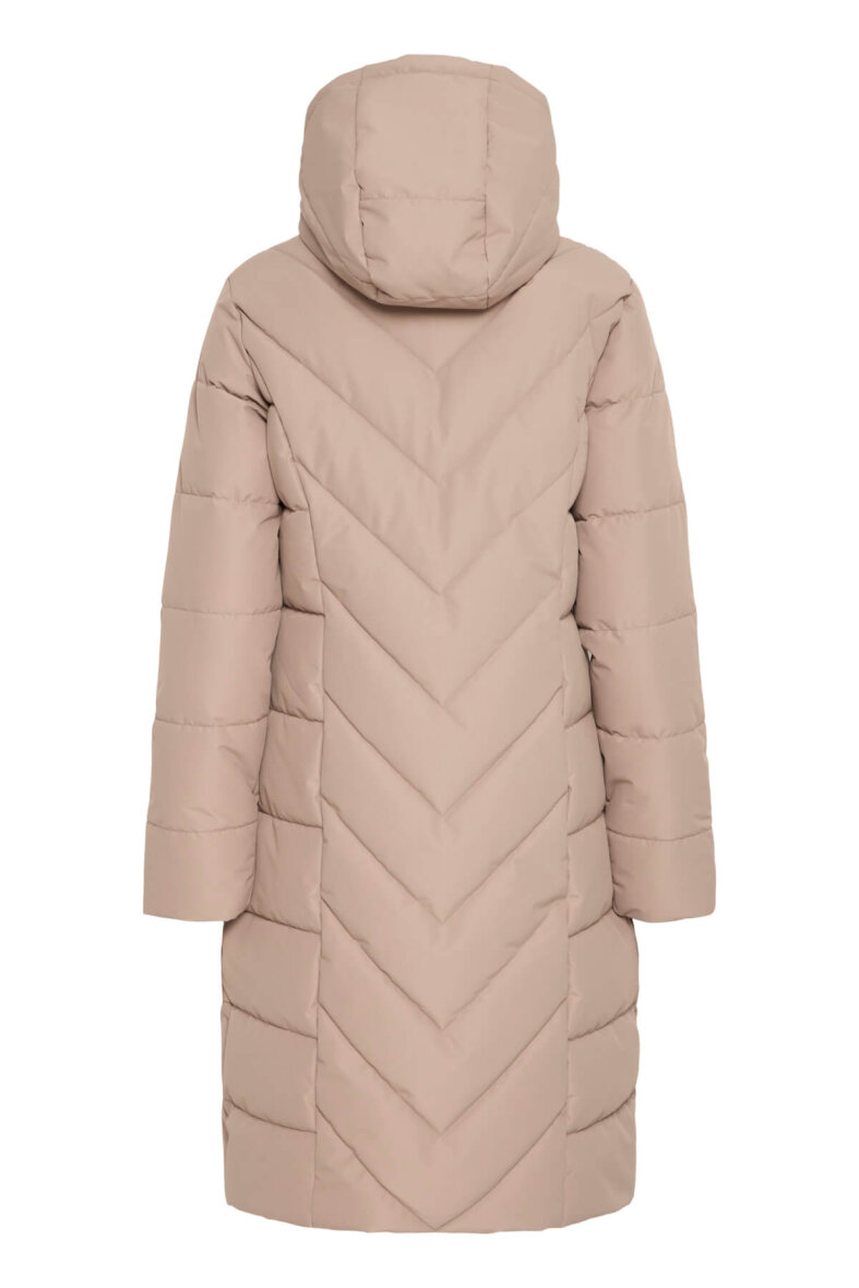 FRANSA jakke i en flot lysebrun farve (Taupe). Denne lange dunjakke er designet med en klassisk pasform og vandret quiltning, der sikrer både komfort og effektiv varmeisolering.
