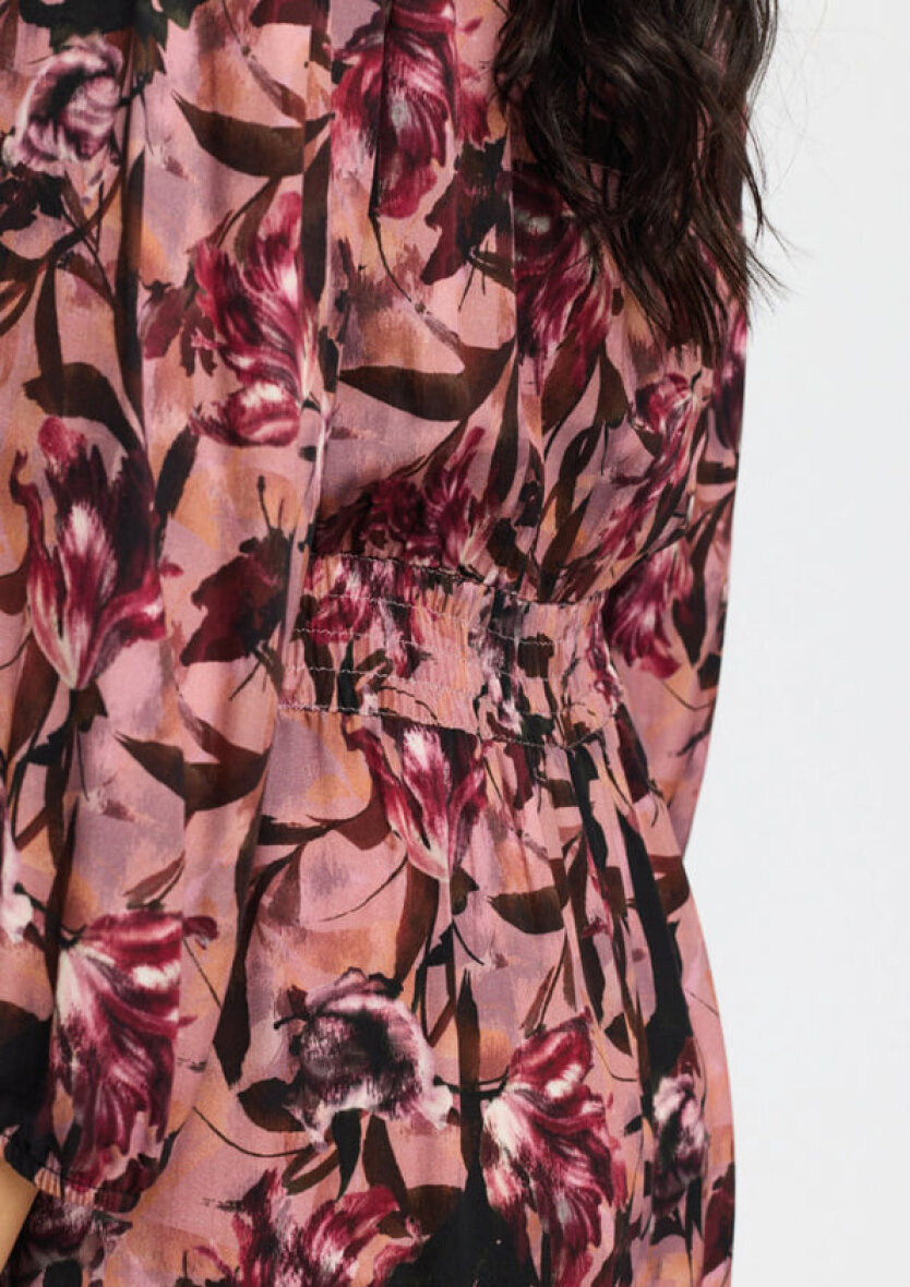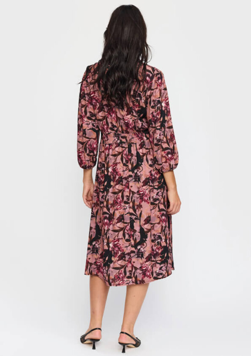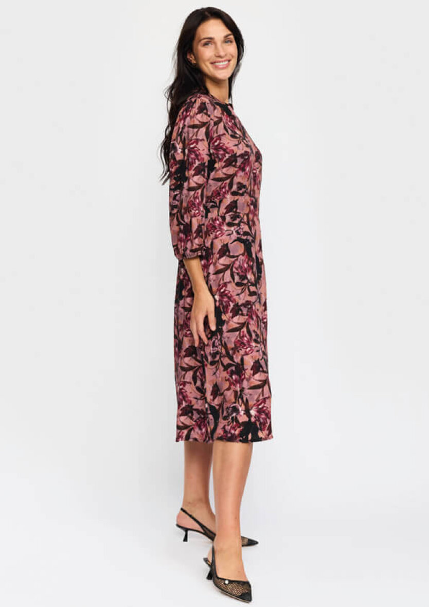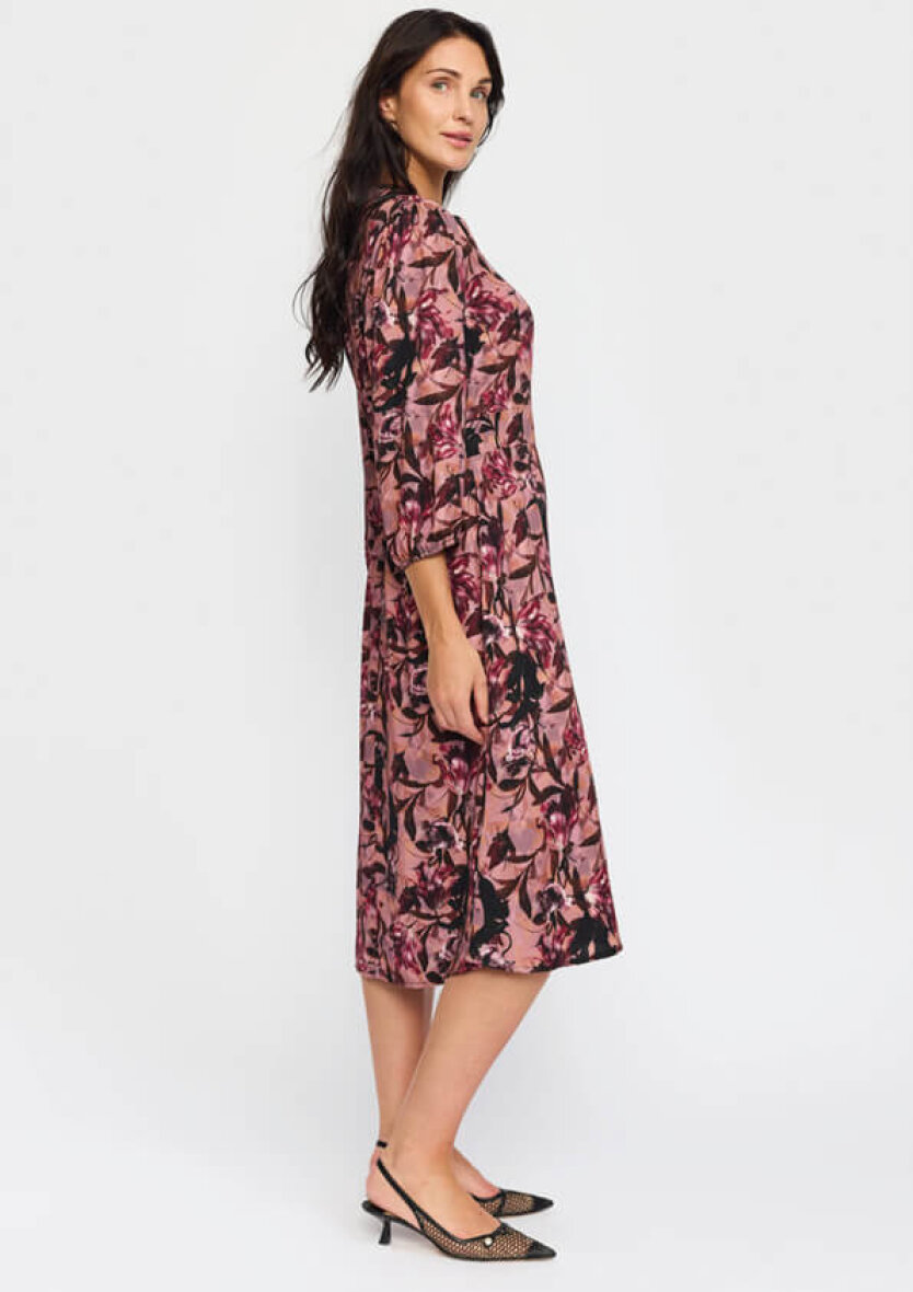 Knælang 2-biz kjole i en skøn rosa base farve med et fint vinrød og sorte blomsterprint. Kjolen er lavet i en lækker blød viskose kvalitet.