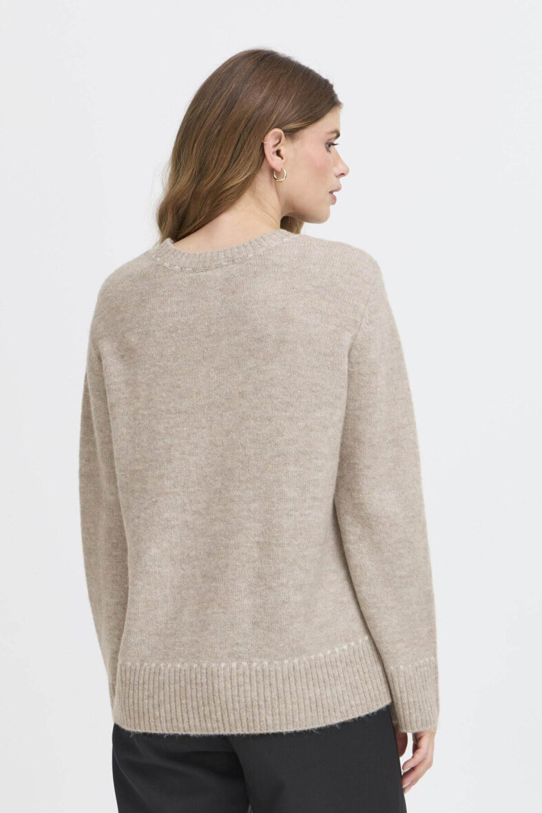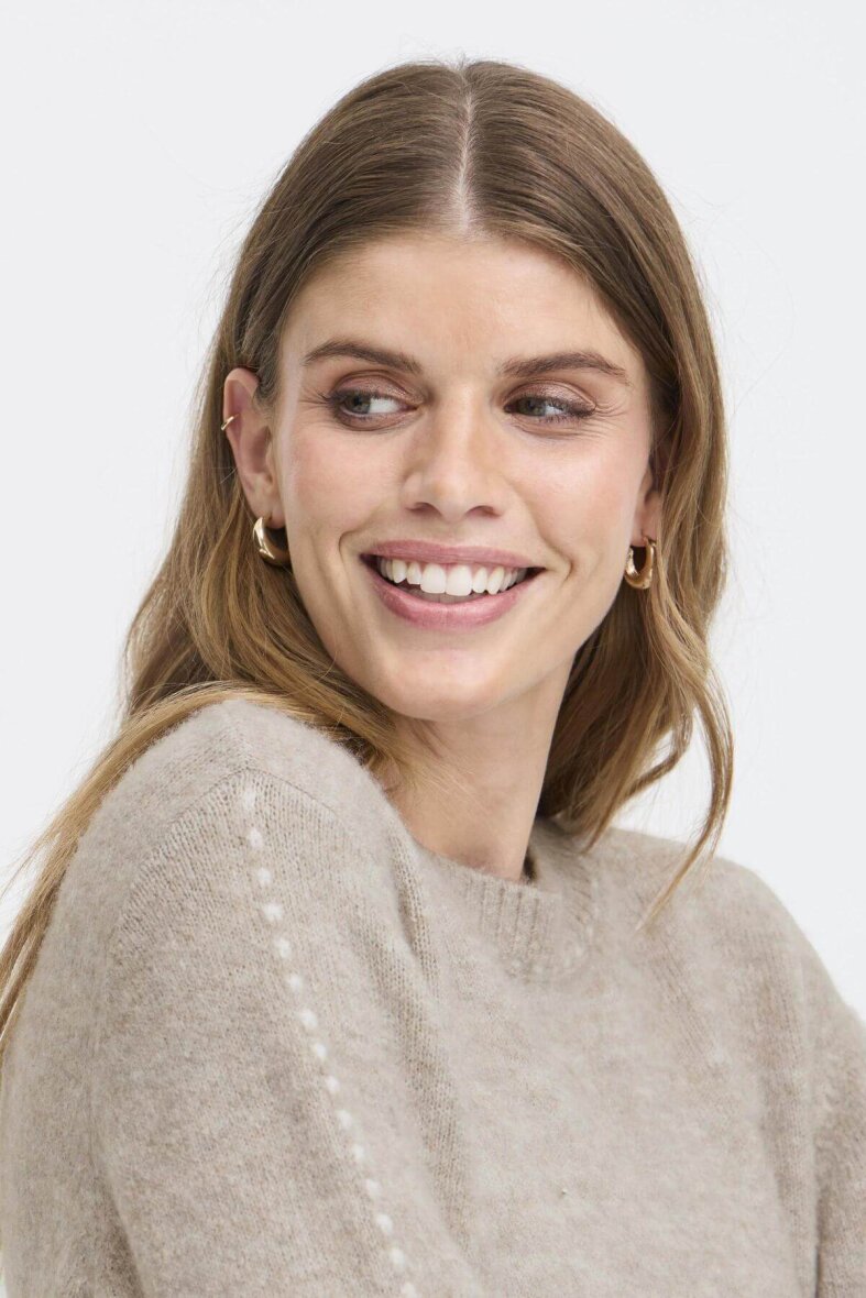 FRANSA striktrøje i en flot lys sandfarve – en neutral klassiker, der passer til alt. Strikken er lavet i en blød og behagelig blanding af akryl og polyester med stræk. Perfekt som et lunt lag på kølige dage, og nem at style over skjorter, kjoler eller til dine yndlingsjeans. Den sandfarvede tone giver et roligt og naturligt udtryk, som holder sæson efter sæson.