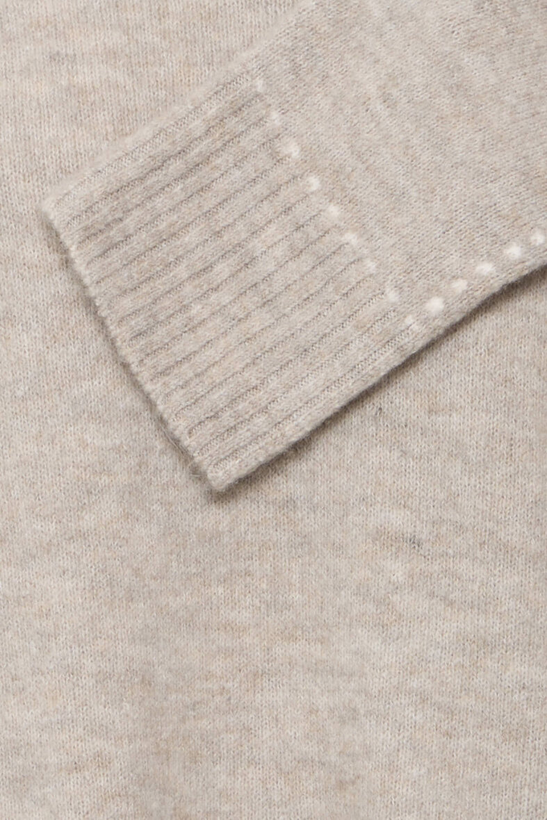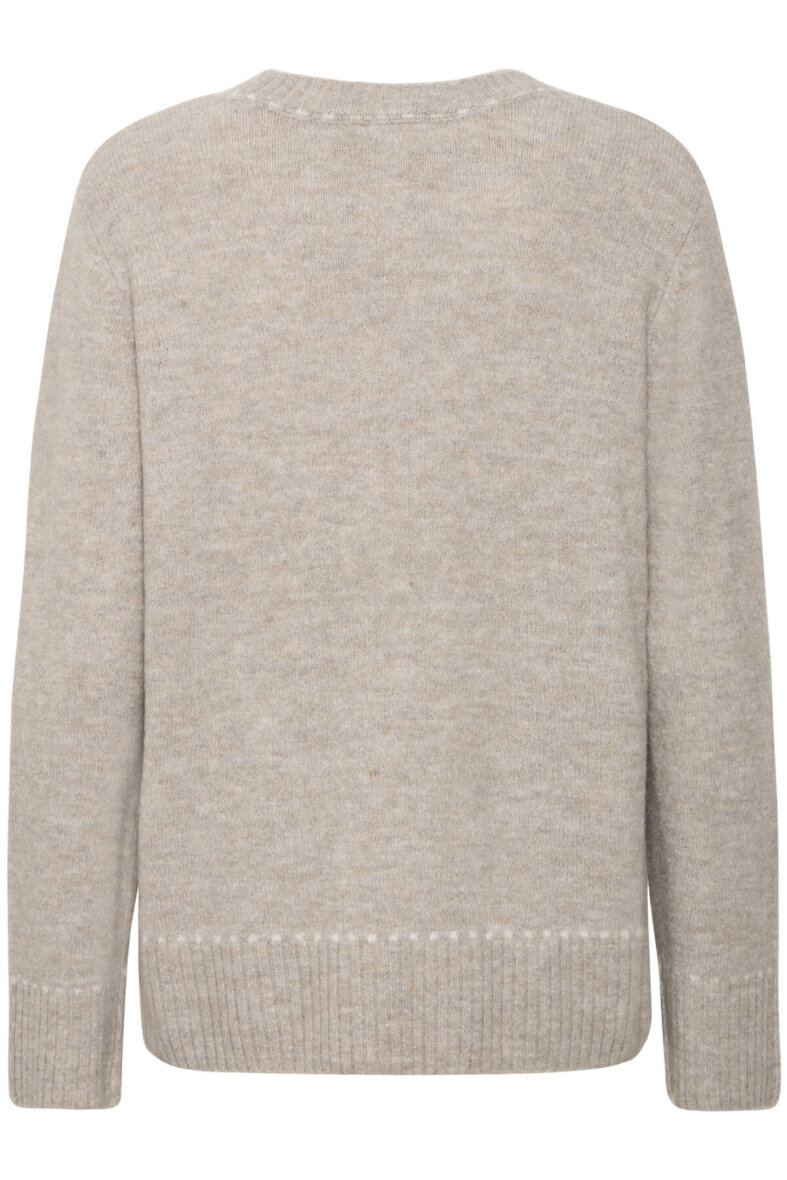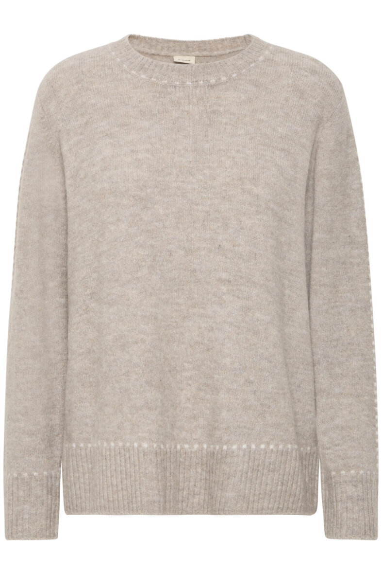 Striktrøjens enkelte design er vævet med en hvis striblet linje som går igen ved halsen, langs ærmer og håndled samt nederst på trøjen, hvilket er med til at skabe en fin og elegant detalje til designet. Striktrøjen er med rund hals, lange ærmer og ribkant ved alle åbninger.