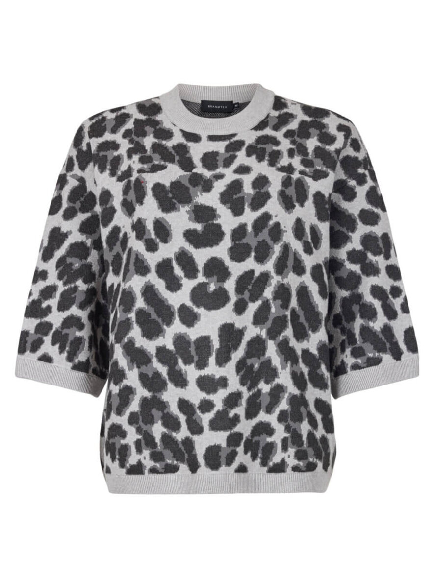 Brandtex striktrøje i et moderne leopard mønster i grå farver. Striktrøjen er med rund hals, 3/4 lang ærmer og ribkant ved alle åbninger.