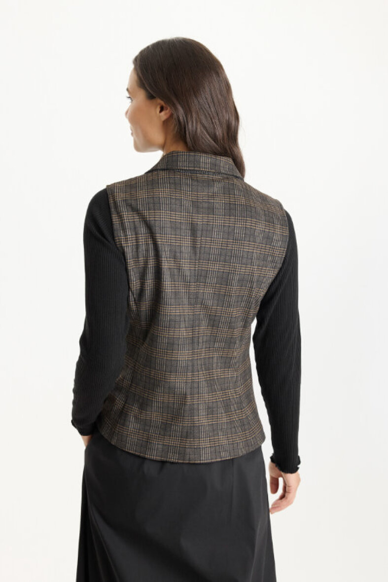 In Front vest i et flot ternet mønster i brune farver. Vesten er med et flot revers, ærmeløs og lukkes med én knap foran. Vesten er med buede kanter og er en anelse længere foran.