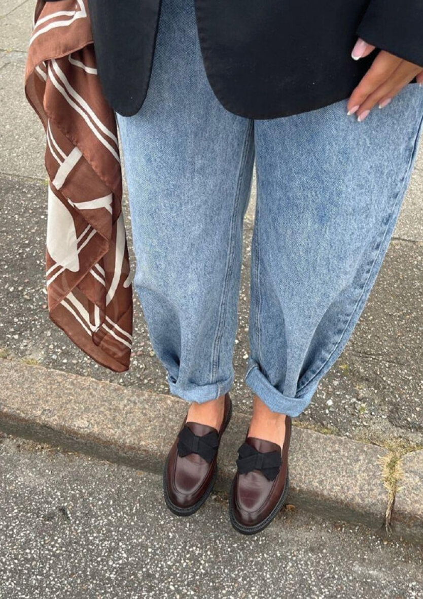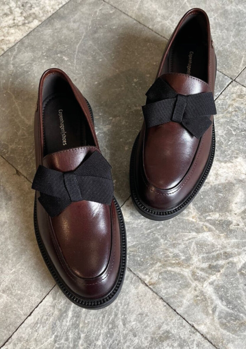 Copenhagen Shoes loafers i en moderne mørkebrun farve i glat skindkvalitet. En fin detalje er den sorte tekstilsløjfe over vristen, der tilføjer et feminint og moderne touch.