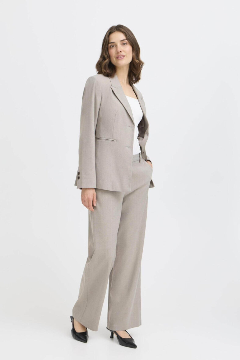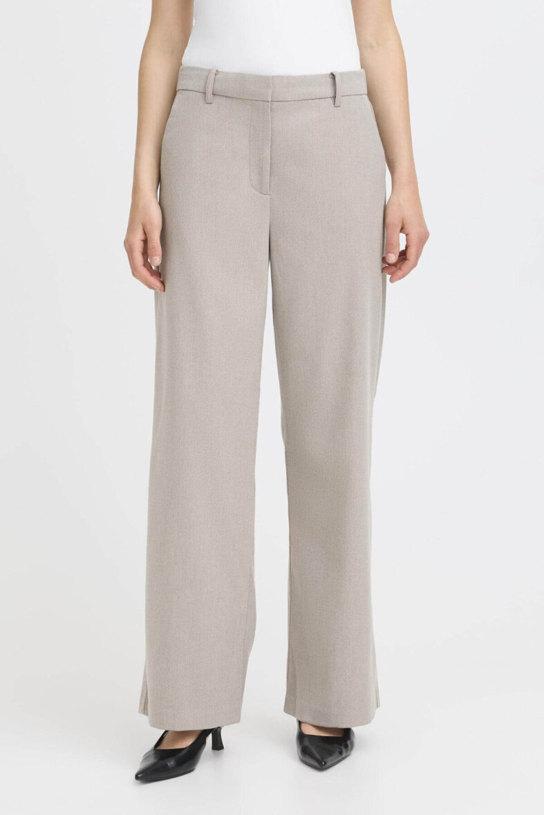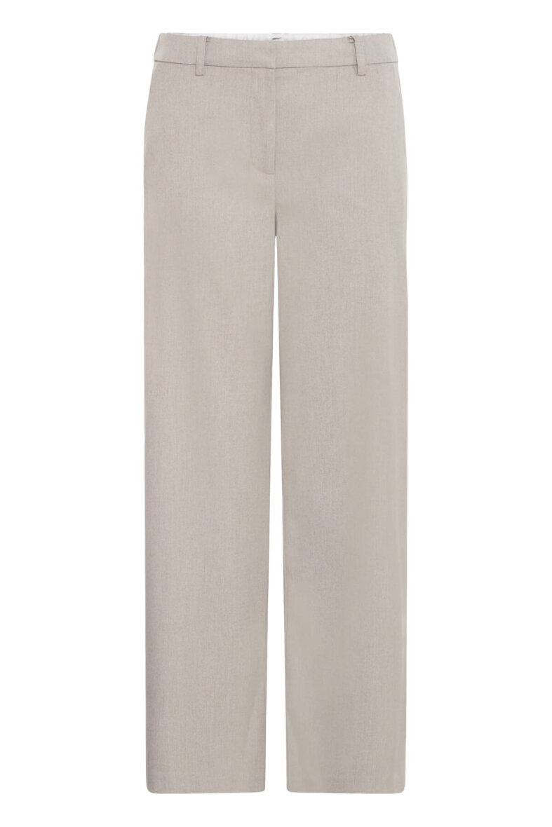 FRANSA bukser i en flot lys sandfarve. Disse bukser er designet med en tidløs, skræddersyet pasform og lige ben med bred vidde ved buksebenet, der falder flot.