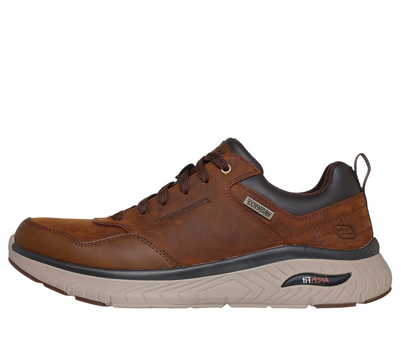 Denne praktiske og vandtætte sko er designet med en slidstærk overdel i læder og syntetisk materiale samt klassisk snørelukning. Indvendigt er skoen udstyret med en udtagelig Skechers Arch Fit®-indersål, der giver optimal svangstøtte og langvarig komfort.