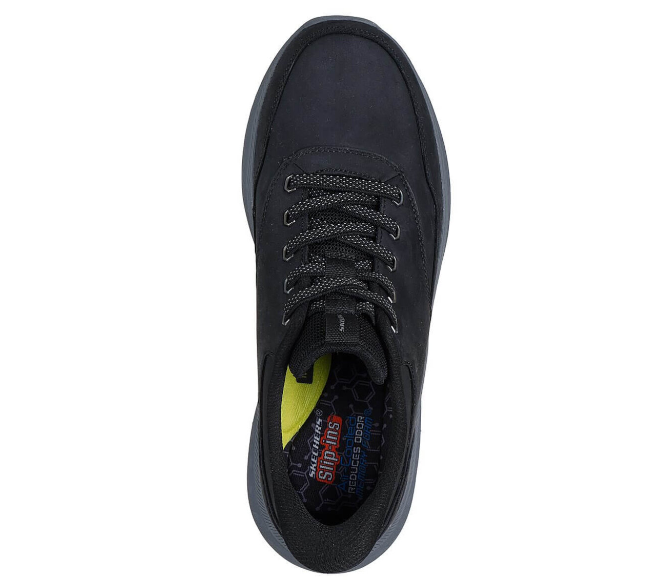 Skechers herre sneakers i en alsidig sort farve, som kan bruges til både hverdag og fint brug. Skoens overdel er i udført i slidstærkt læder og syntetisk materiale ved åbningen. Skoen er med elastiksnøre over vristen og slip-in teknologi.