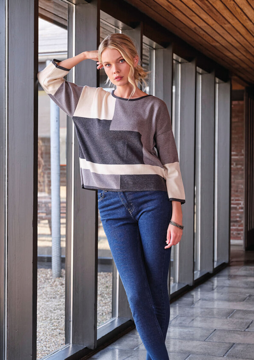 Trøjen er med rund hals, 3/4 lange ærmer samt ribkant ved alle åbninger. Striktrøjen er lavet i en dejlig blød kvalitet i en bomuldsblanding, som er særdeles behagelig at have på.