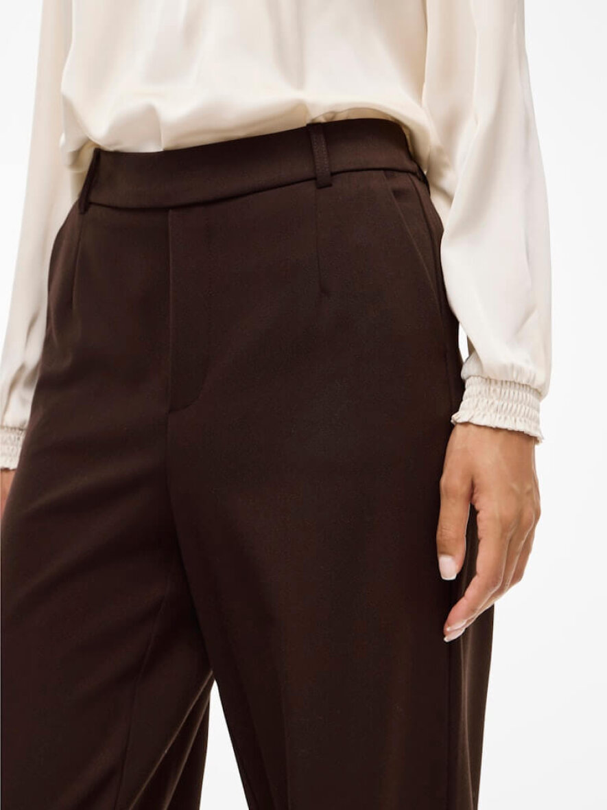 Flot højtaljet Vila buks i et enkelt og elegant design. Vivarone High Waist Wide Pant i en moderne brun farve - et stilfuldt valg til både hverdag og arbejde. Farven er varm og jordnær, hvilket gør dem nemme at kombinere med både neutrale og farverige overdele.