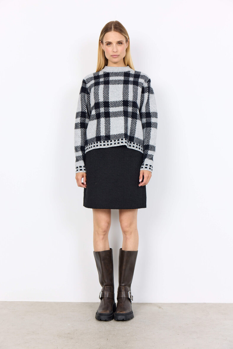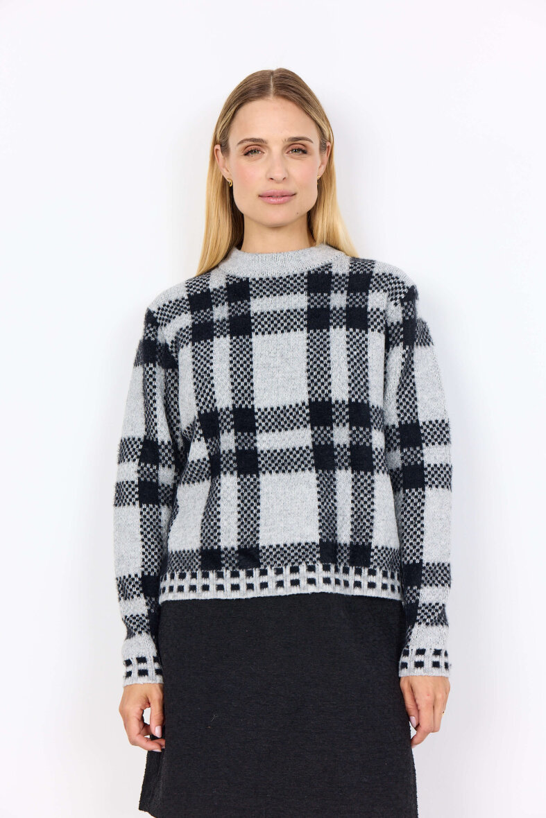Denne grå striktrøje fra Soyaconcept med sort ternet mønster kombinerer tidløs stil med blød komfort. Det grafiske tern tilføjer karakter og kant til den neutrale grå base, hvilket gør trøjen både alsidig og iøjnefaldende. Den har en behagelig pasform og er strikket i en blød kvalitet, der egner sig perfekt til både hverdagsbrug og lag-på-lag styling. Brug den over en skjorte for et klassisk look eller sammen med jeans for et afslappet udtryk.