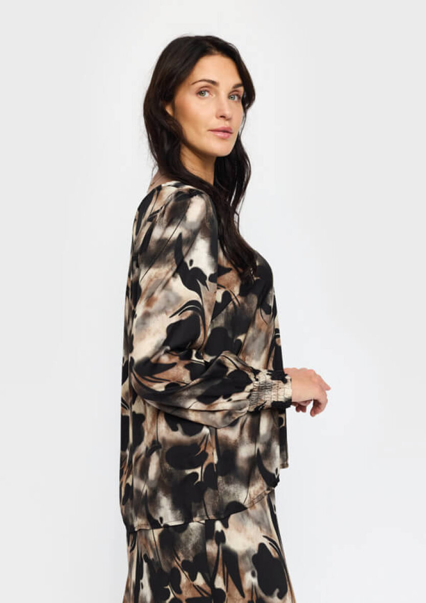 2-Biz bluse i modellen SUSINE er et stilfuldt valg til dig, der elsker unikke prints og komfort i hverdagen. Blusen er lavet i en silkeblød blanding af silke og viskose, som giver et glansfuldt og sofistikeret udtryk.