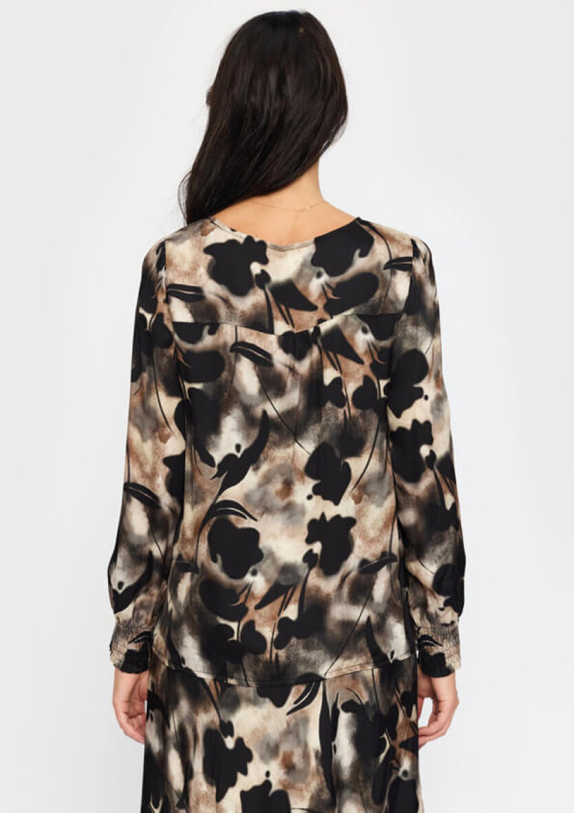 Blusen er med rund hals og lange ærmer som afsluttes med smock kant, som skaber en fin poset effekt, der giver et feminint og afslappet udtryk.
