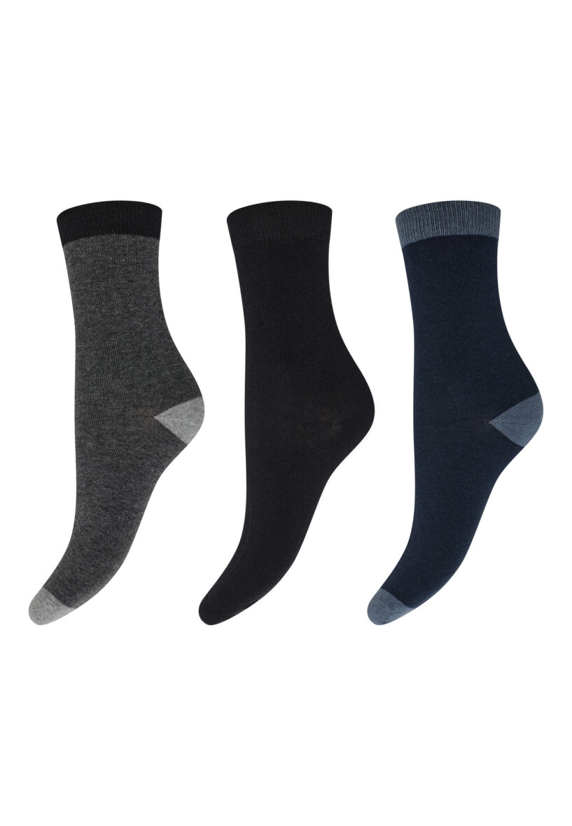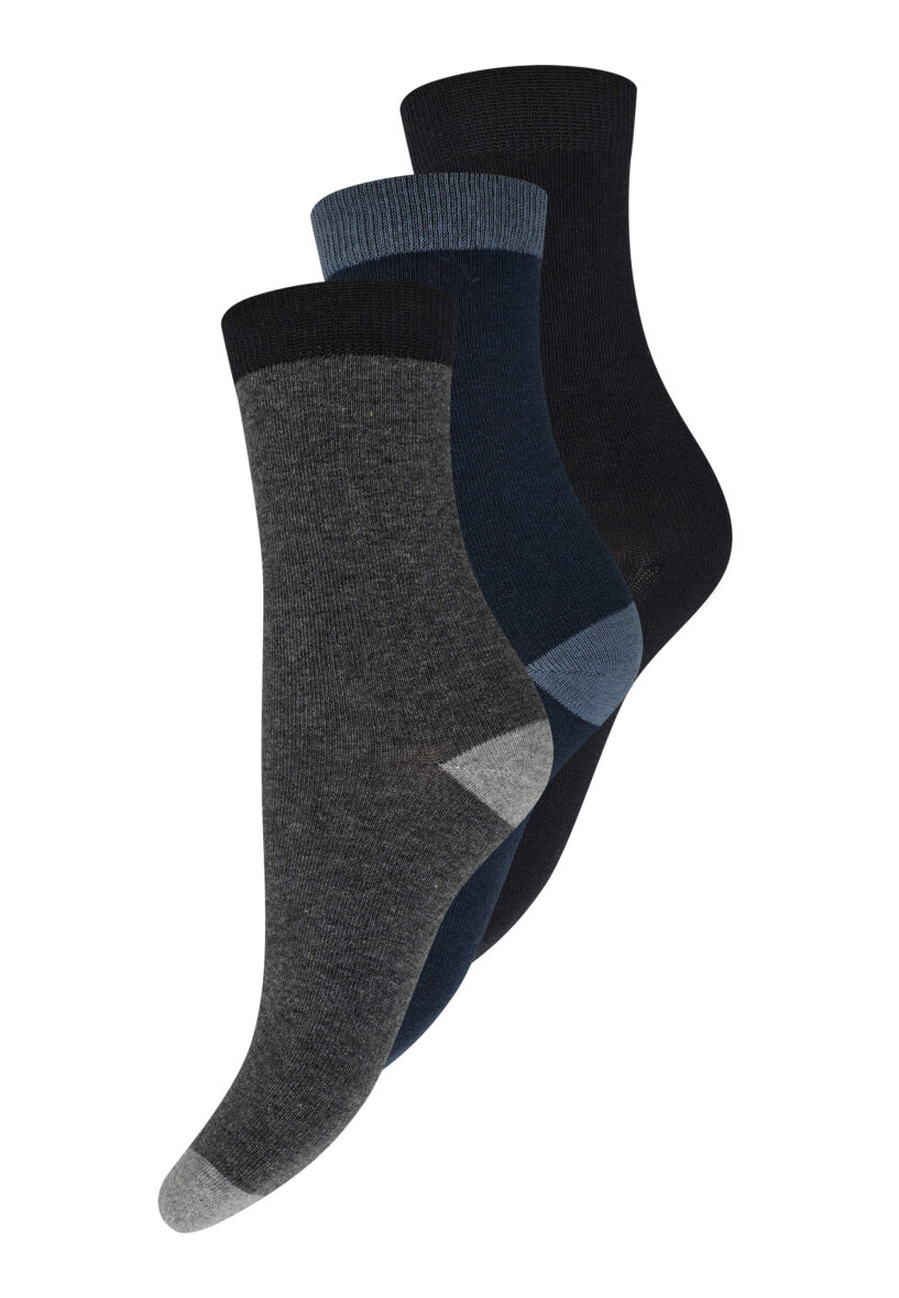 I denne praktiske 3-pak får du tre klassiske farver – mørkegrå, sort og navy – alle med diskrete kontrastdetaljer ved hæl og tå, der giver et moderne touch.