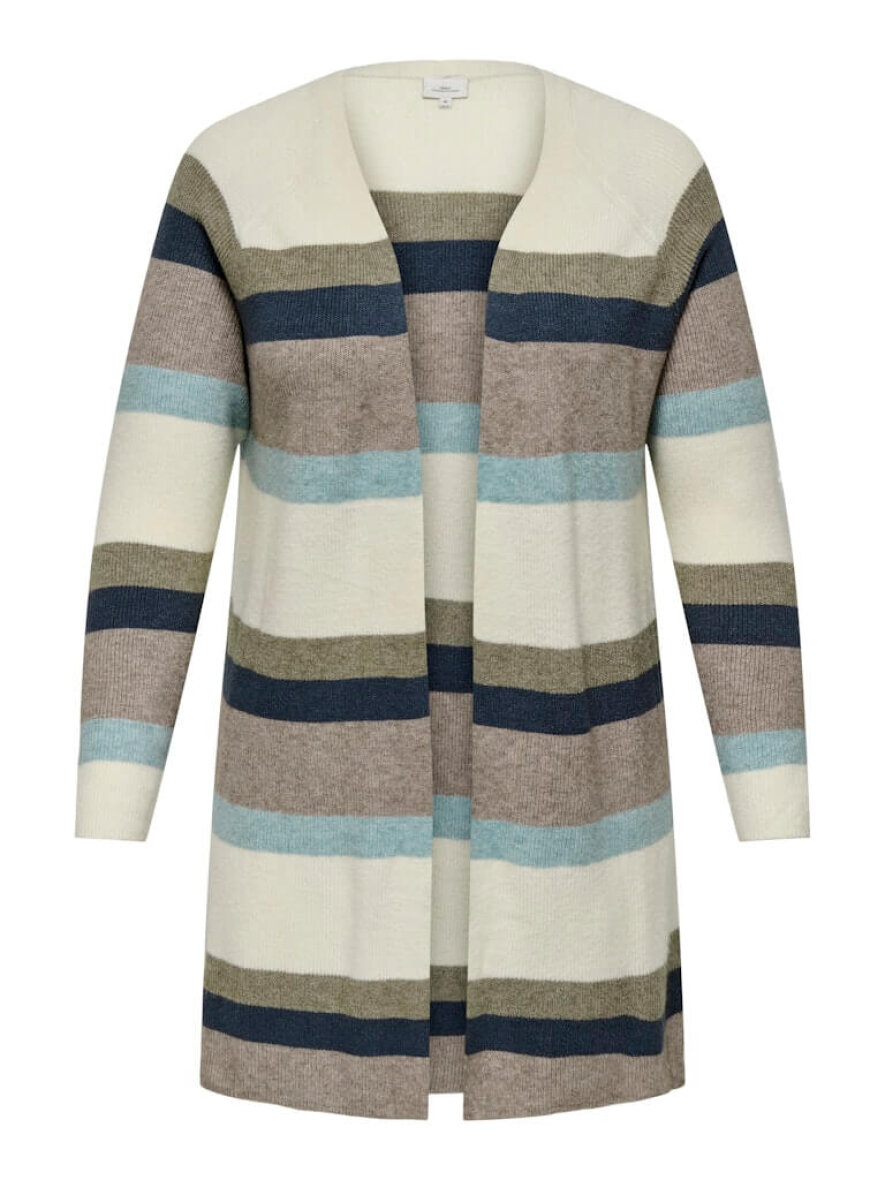 Only Carmakoma cardigan i et flot stribet design med beigefarvet base, og brune og blå farvet striber.