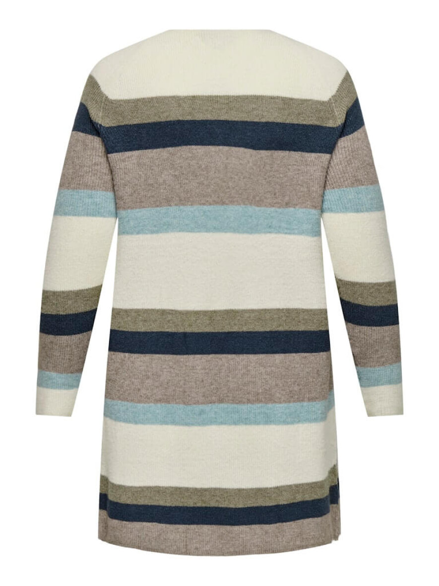 Den stribet cardigan er lavet i en blød og behagelig kvalitet med ribbet design. De klassiske striber giver et tidløst udtryk, som nemt kan styles til både jeans, bukser eller over en kjole. Perfekt som et let lag til både hverdag og overgangssæsoner.