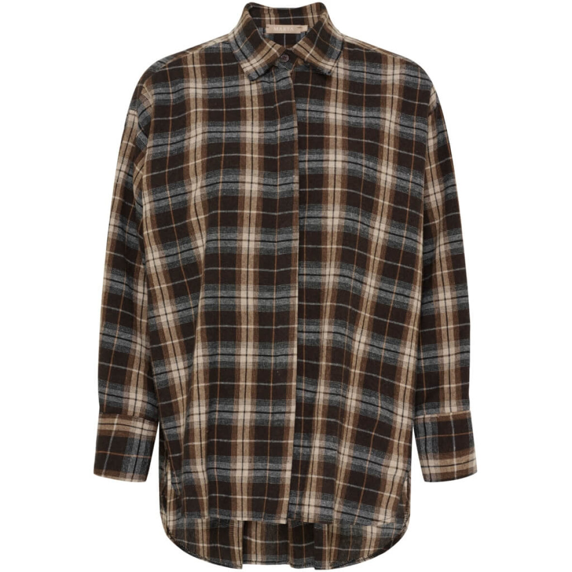 Marta Du Chateau skjorte i et moderne ternet print i brune nuancer. Skjorten er lavet i en skøn bomuld og polyester kvalitet i en afslappet onesize pasform, som passer størrelserne 38-44.
