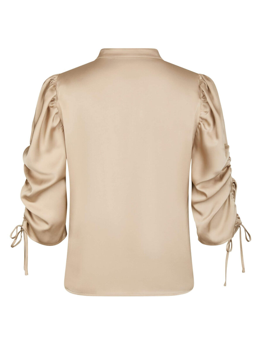 Blusen er med v-halsudskæring med stolpeluk, overskæringen ved skuldrene der giver rynkeeffekt samt let puf ved skuldrene. Blusens 3/4 lange ærmer er med en smuk løbegang med snøre langs ærmet.