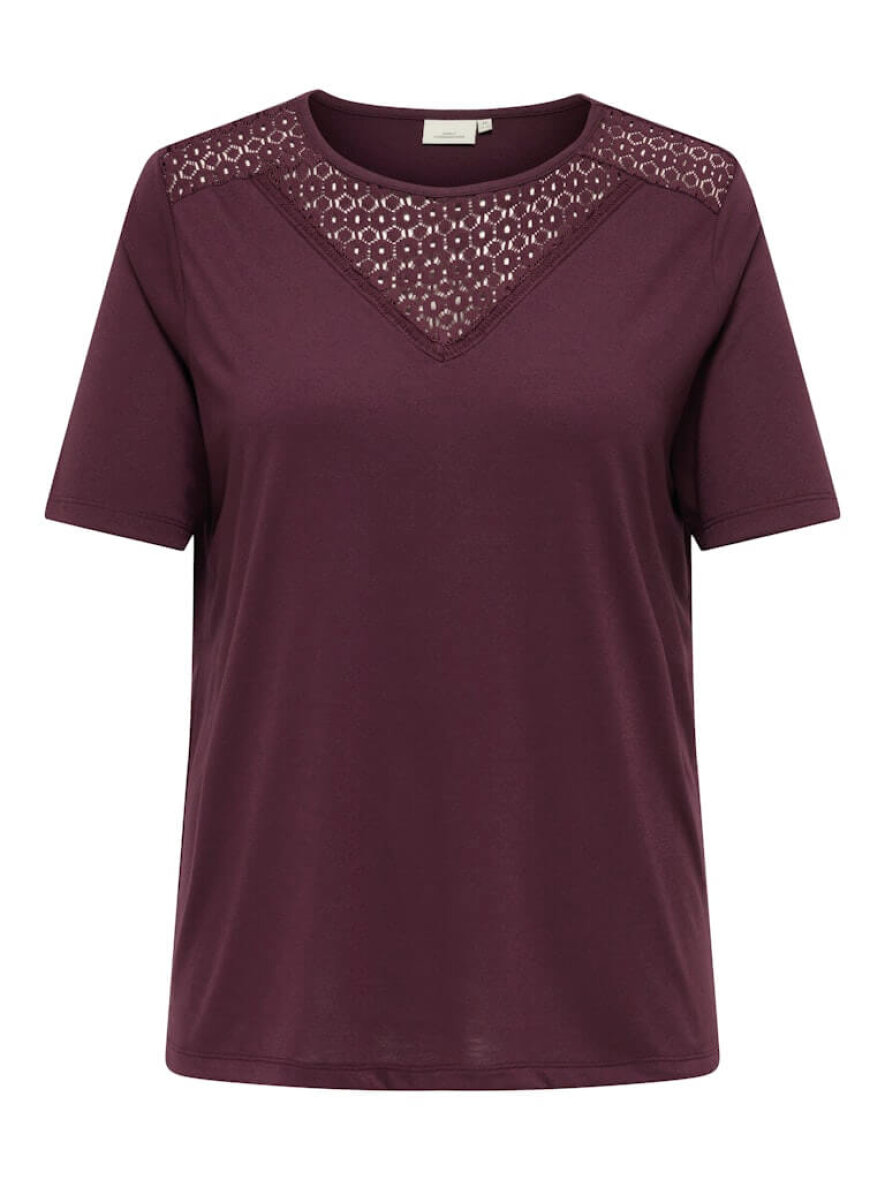 Only Carmakoma t-shirt / bluse i en flot bordeaux rød farve. T-shirten er med rund hals med et feminint blonde design, som er med til at give et twist til basis blusen.