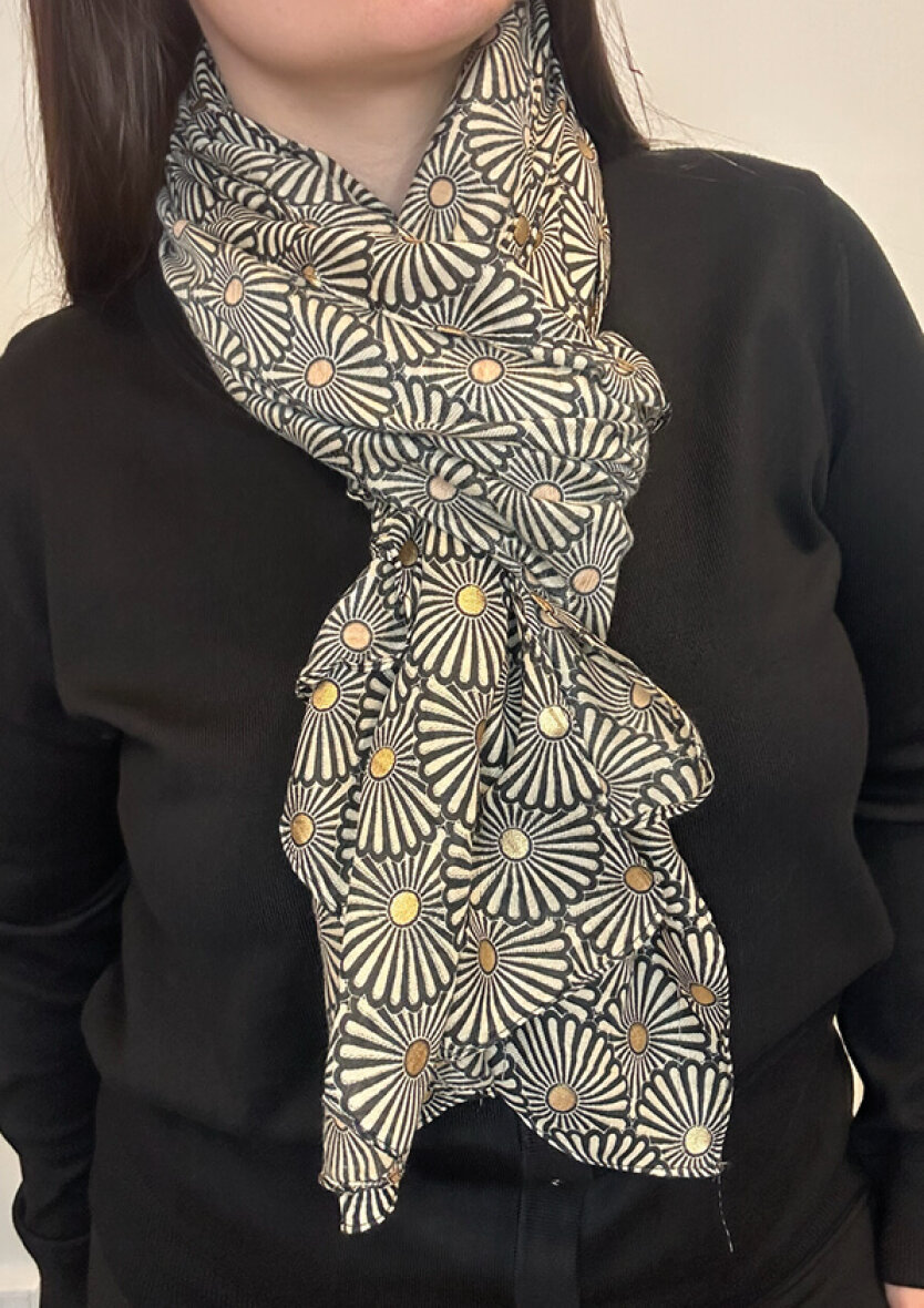 Lækkert tørklæde fra Lisbeth Merrild. Tørklædet er lavet i et flot design brune blomster med sort omrids og en midte i guld.
