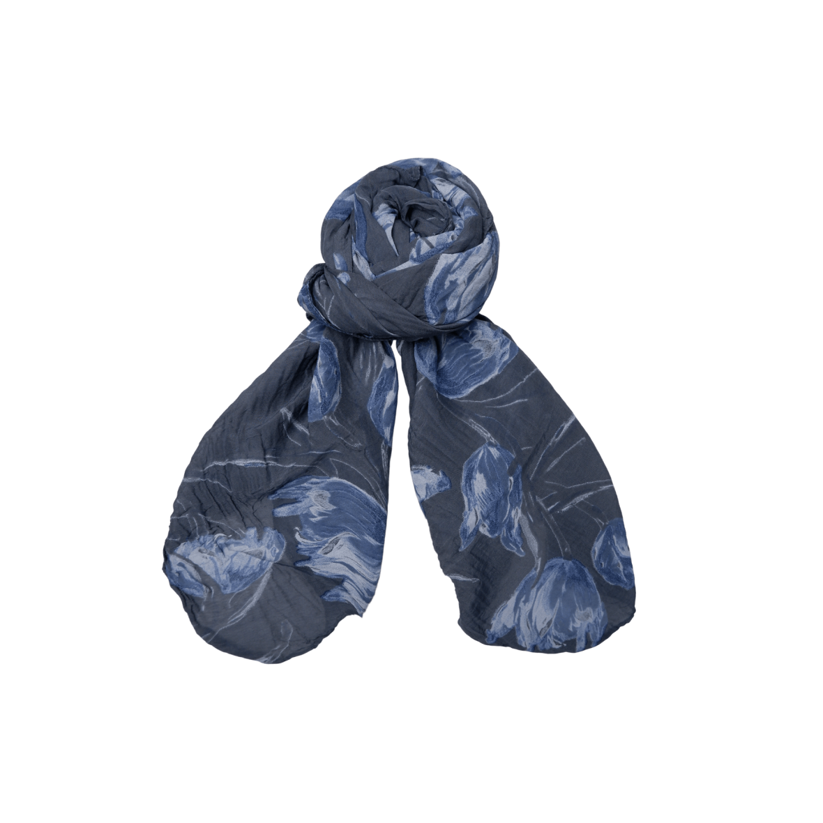 Black Colour tørklæde i en blød bomuld-silke blanding, prydet med et blomstret mønster i blå nuancer. Det fine materiale føles behageligt mod huden, mens det kunstneriske design giver et moderne og elegant løft til ethvert outfit. Ideelt til både hverdag og særlige anledninger.