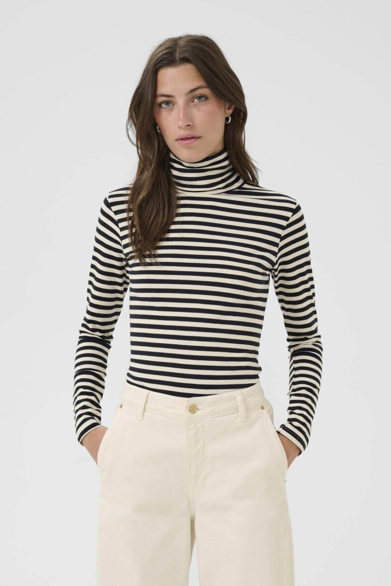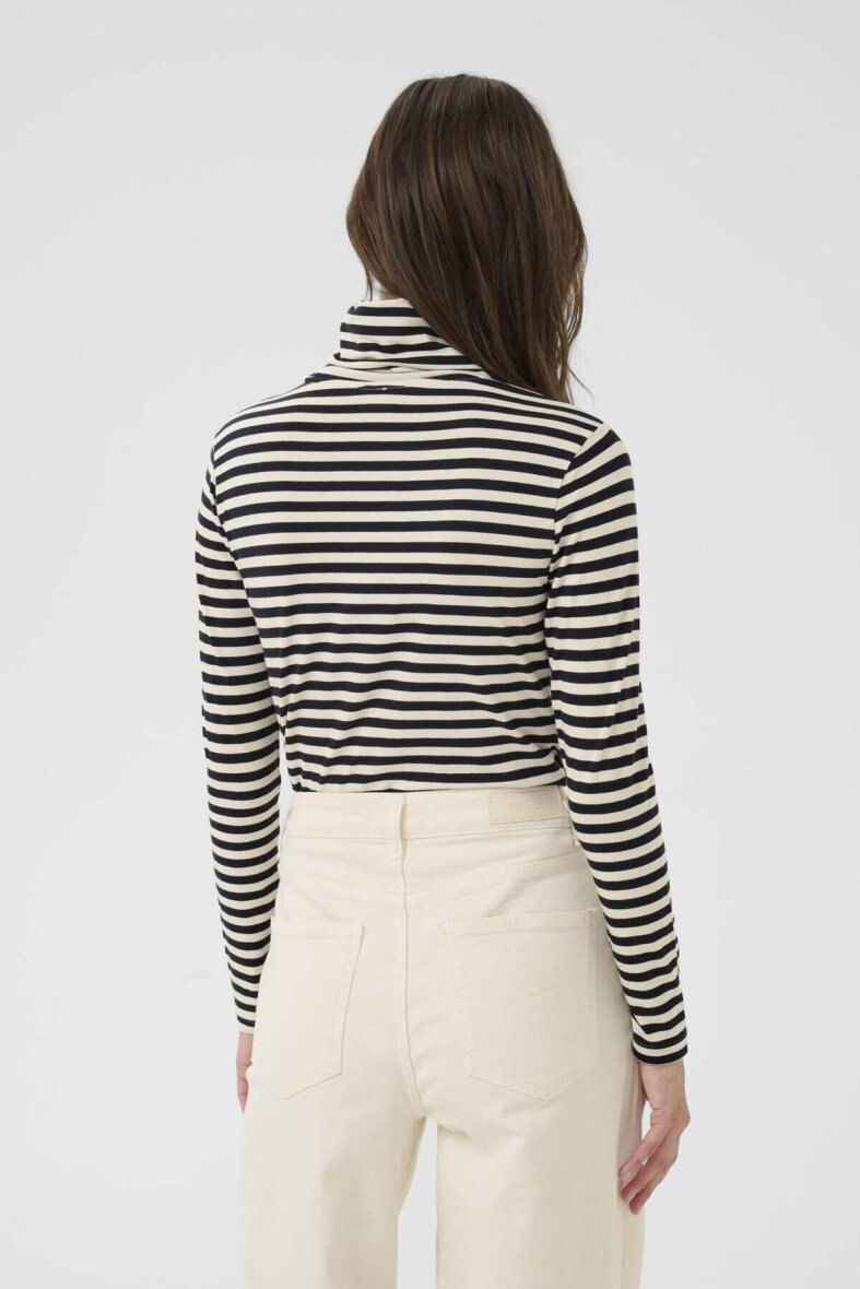 Part Two bluse med rullekrave med off white og navy striber er fremstillet i en blød og strækbar kvalitet, der sikrer en tætsiddende og komfortabel pasform.