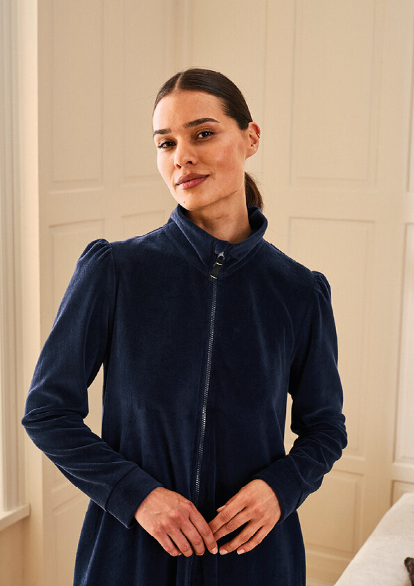 Flot lang morgenkåbe fra Decoy i en skøn navy blå farve. Morgenkåben er lavet i en dejlig blød velour kvalitet udenpå. Morgenkåben er med høj hals og gennemgående lynlås foran. Morgenkåben er med lange ærmer og lommer i siderne.
