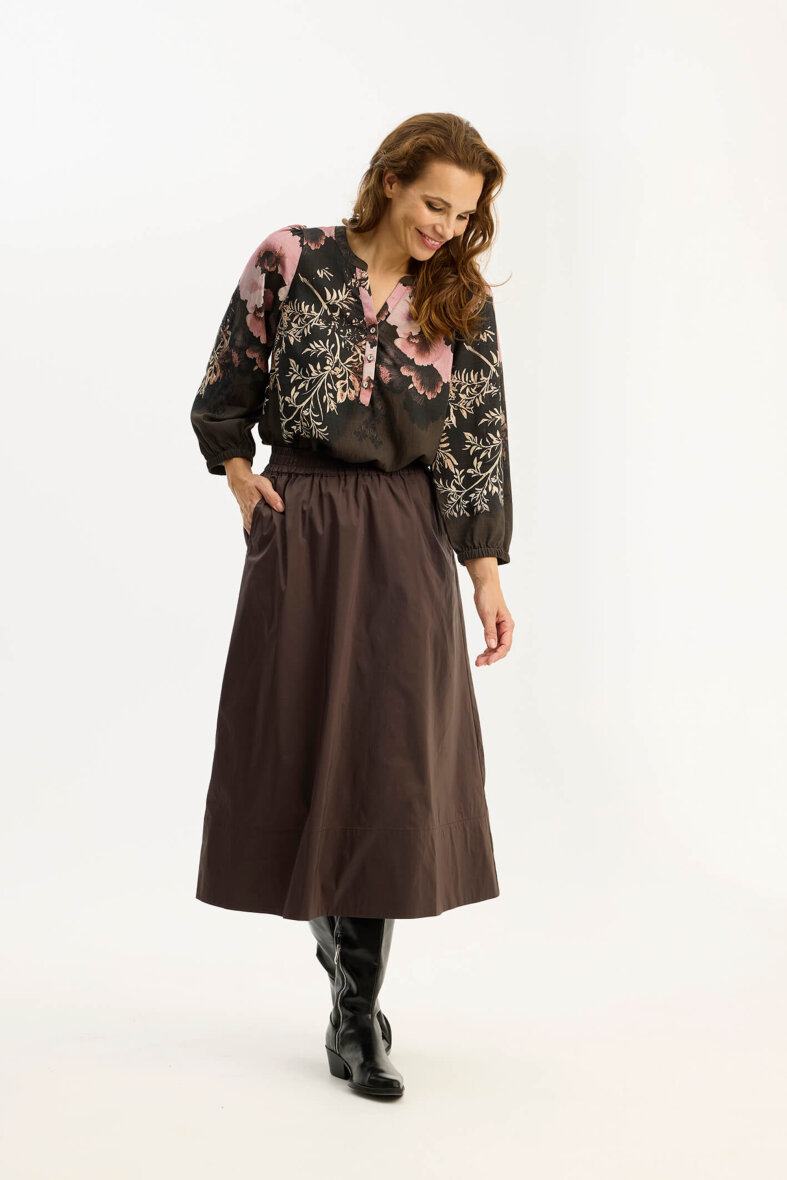 In Front midi nederdel i en alsidig mørkebrun farve i poplin kvalitet. Nederdelen er lavet i et mellem langt a-formet design i en afslappet pasform. Nederdelen er lavet med bred elastikkant i taljen for et godt fit samt praktiske skrålommer i siderne.