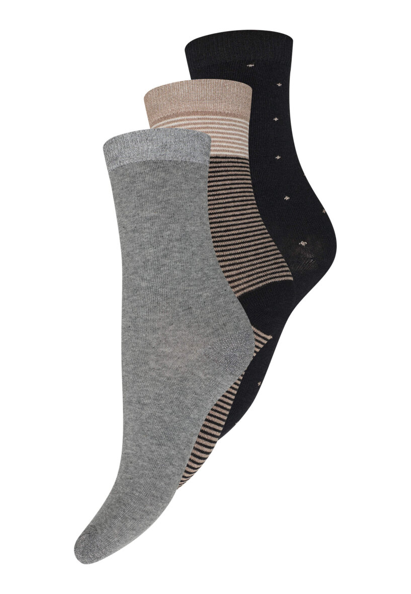 I denne praktiske 3-pak får stribet og prikket designs med glimmertråde – alle med diskrete kontrastdetaljer ved hæl og tå, der giver et moderne touch.
