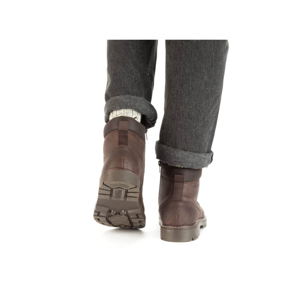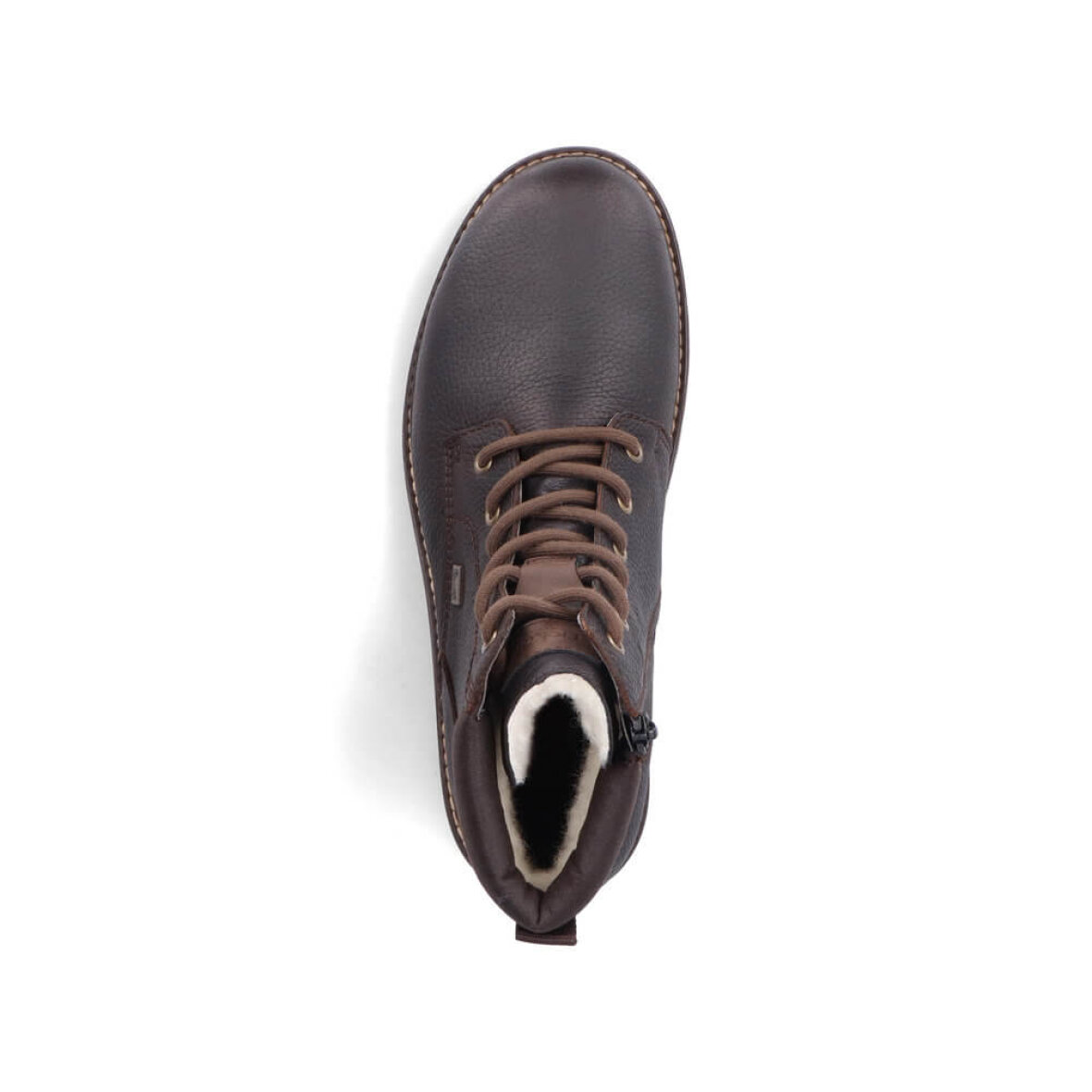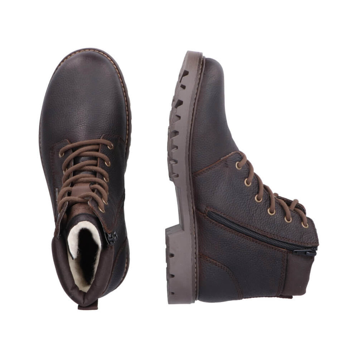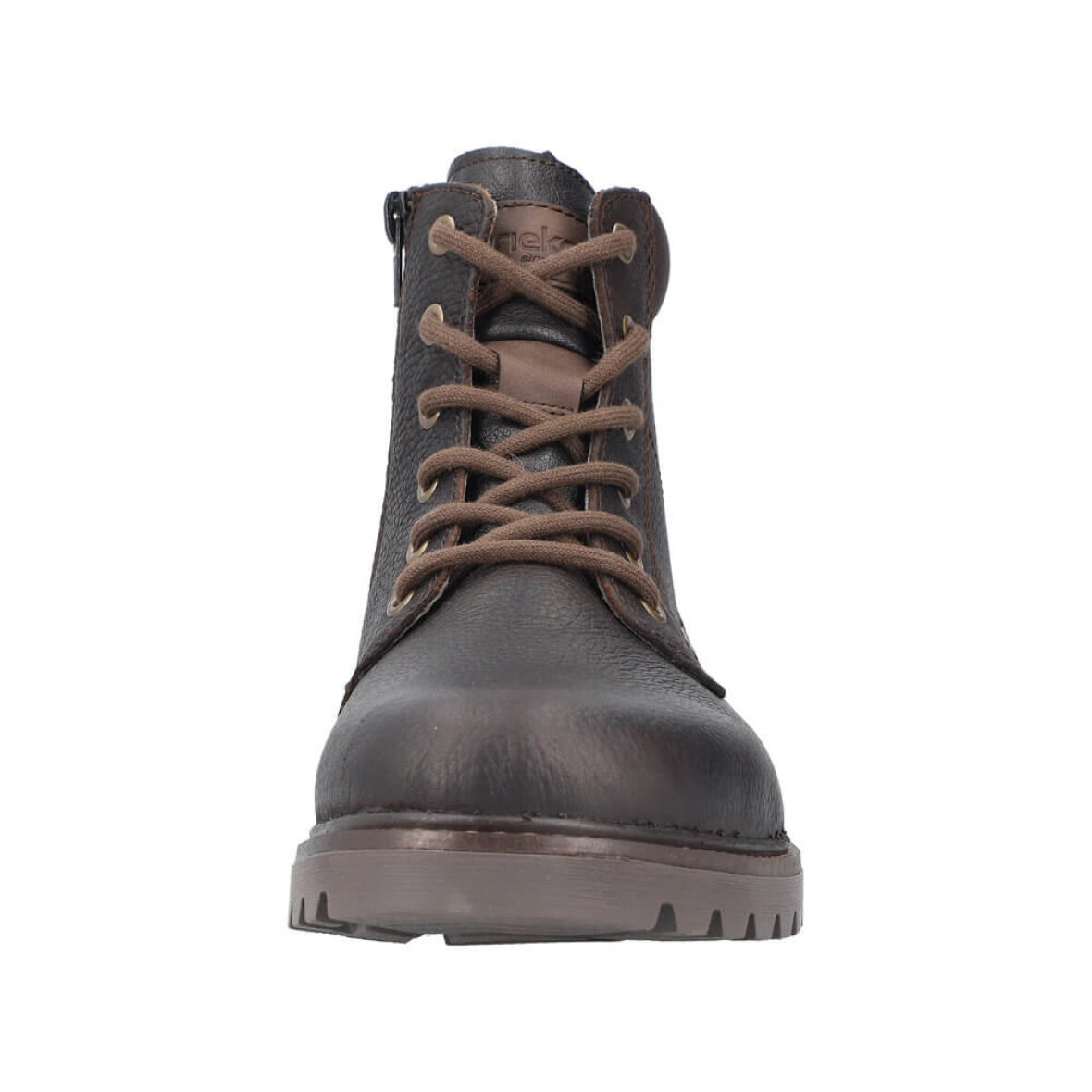 Rieker snørestøvler i en moderne mørkebrun farve. Den smarte kombination af snørebånd og lynlås giver perfekt støtte og gør støvlen nem at tage af og på. Støvlen er lavet i en kombination af skind og imiteret skind med fine stikningsdetaljer langs kanten.