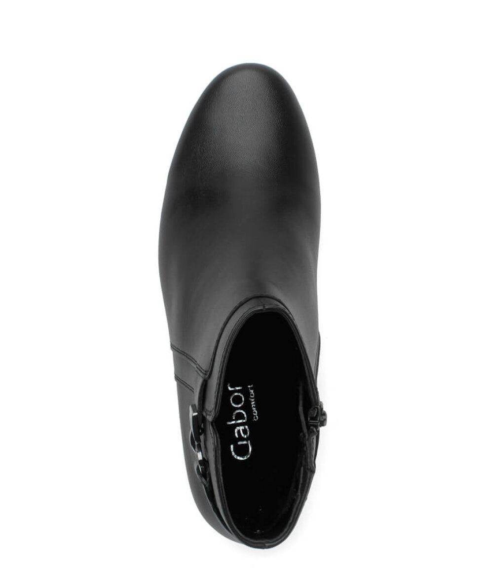 Elegant ankelstøvle i sort skind fra Gabor. Støvlen er lavet i et stilrent design med en dekorativ spænde detalje på ydersiden og en funktionel lynlås på indersiden for nem af- og påtagning.