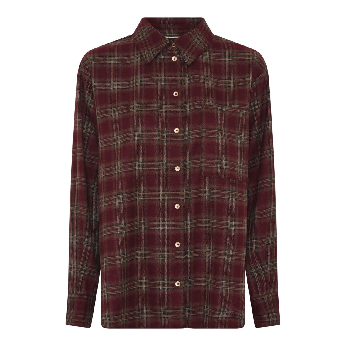 Soulmate skjorte i et traditionelt ternet mønster i dybe nuancer af bordeaux, grøn og sort, hvilket giver et rustikt og efterårsvenligt udtryk. Skjorten er designet med lange ærmer med manchet knapluk og en åben brystlomme på venstre side. Hunter skjorten er med gennemgående knaplukning med lyse knapper, der skaber en flot kontrast til det mørke stof.