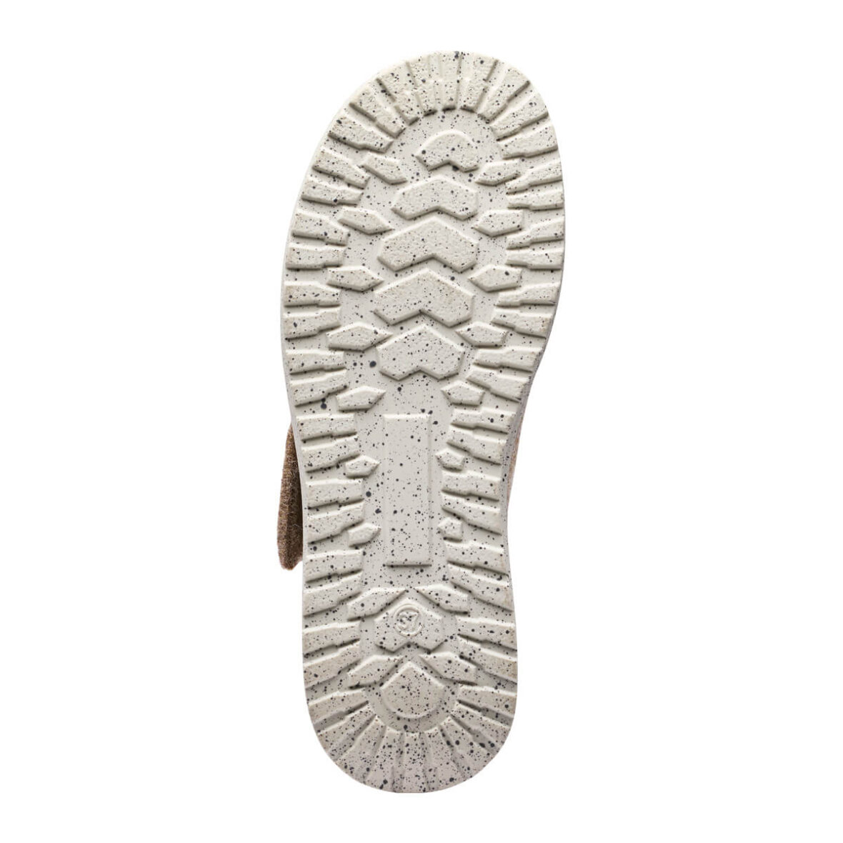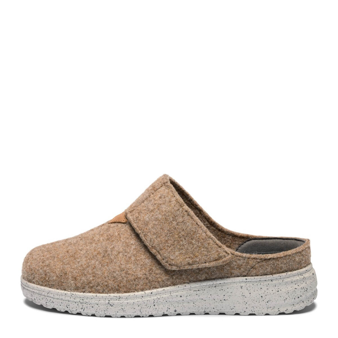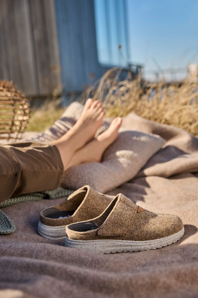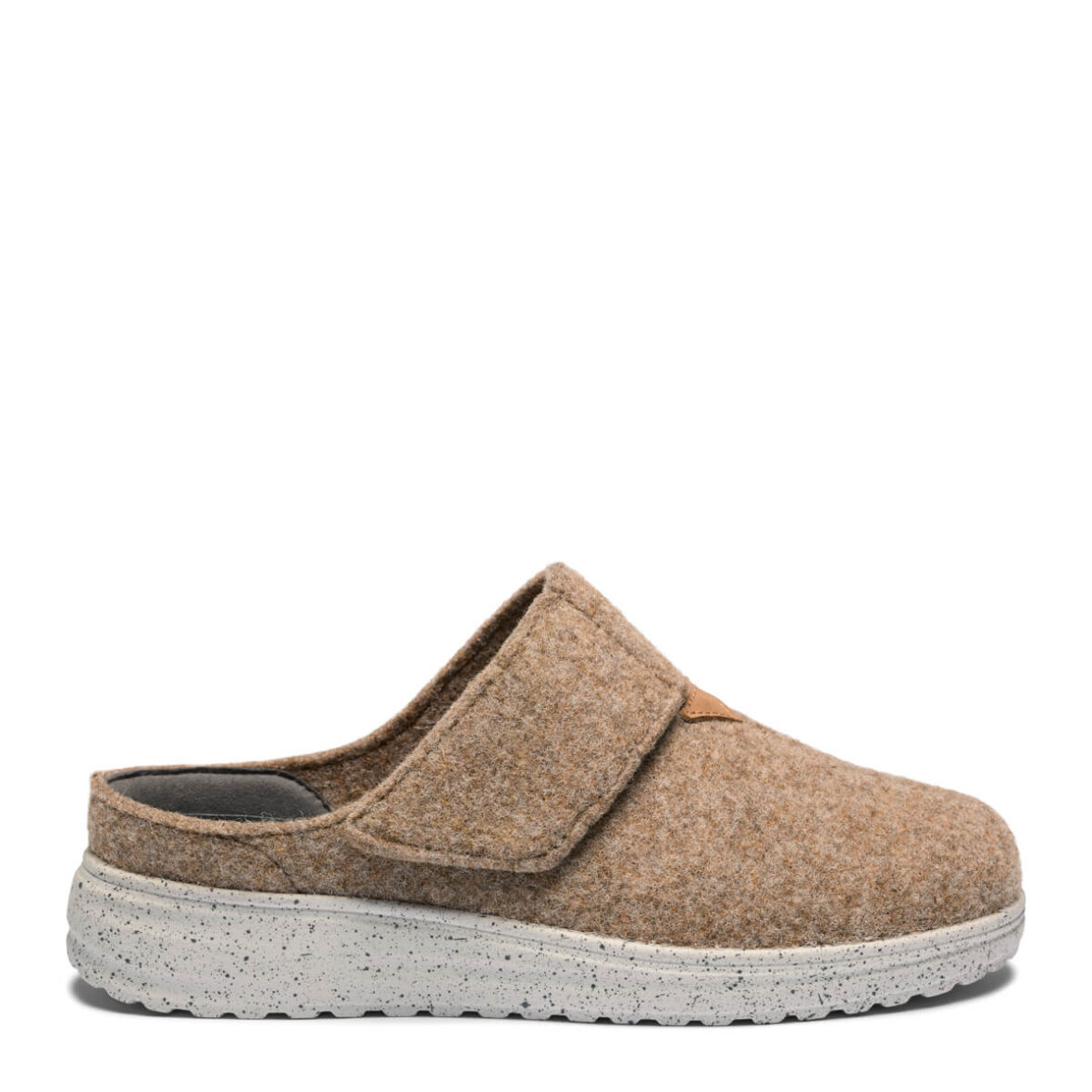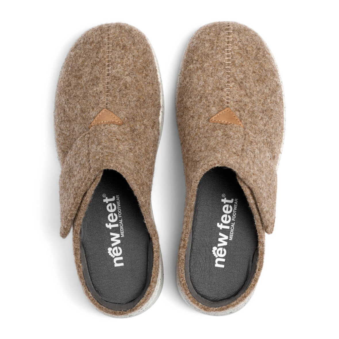 New Feet hjemmesko i en flot lysebrun farve. Den åbne hjemmesko er lavet i filtet uld i overdelen og liningen. Hjemmeskoen kan reguleres med en bred velcrorem, så den nemt kan tilpasses til netop din fod.