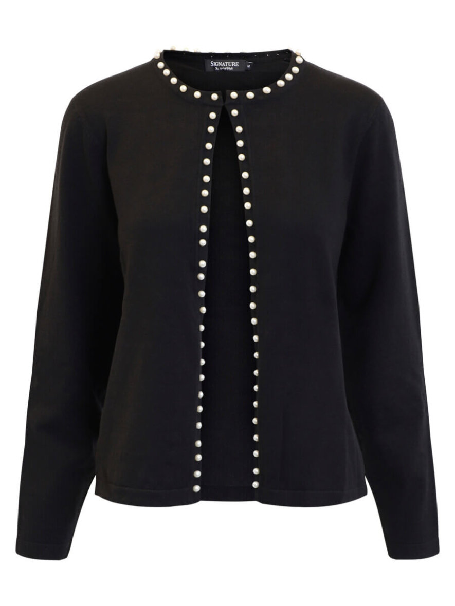 Signature cardigan i en alsidig sort farve med dekorative perler langs åbningen samt halsåbningen, hvilket giver et eksklusivt udtryk.