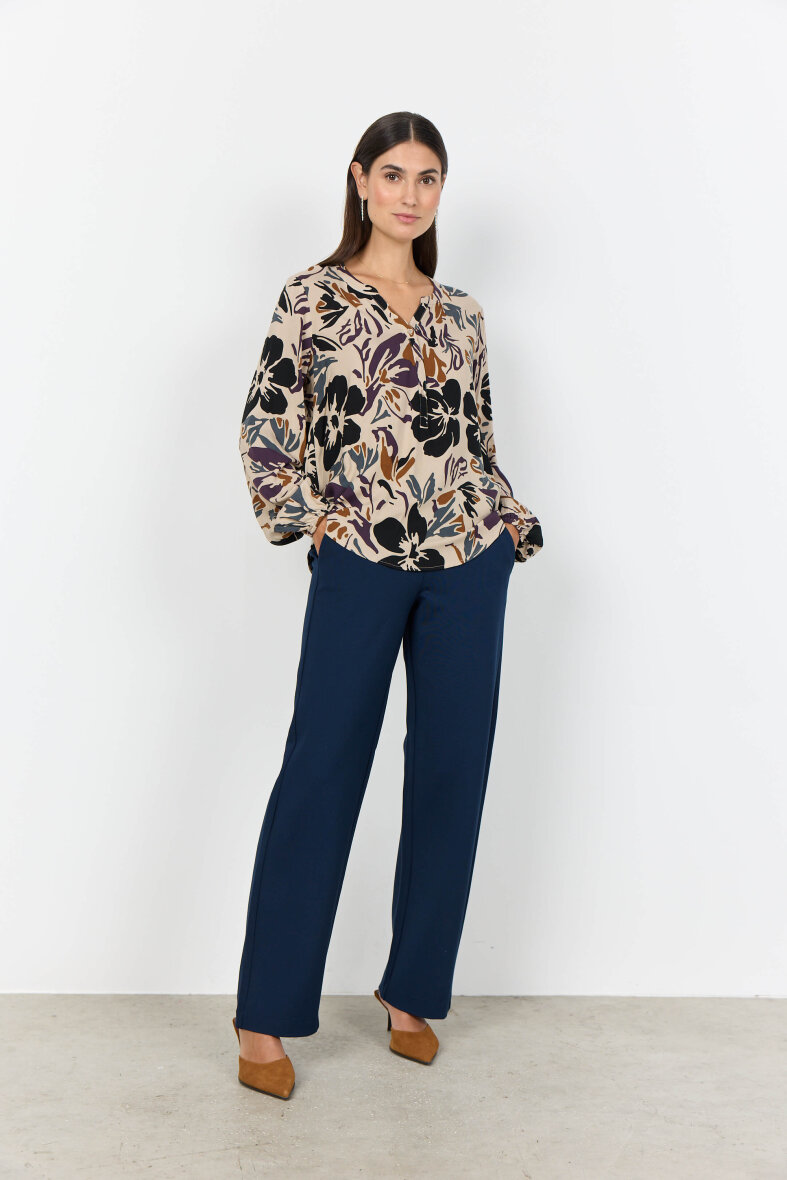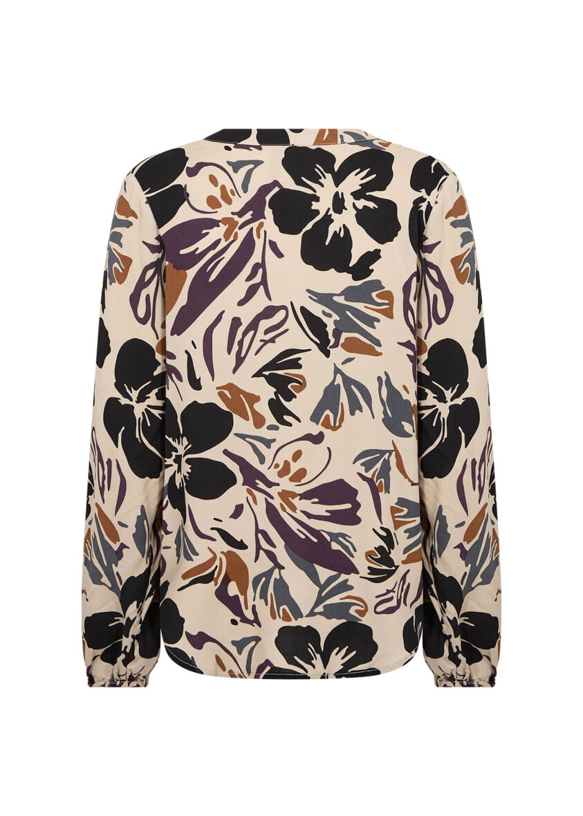 Soyaconcept bluse med en flot sandfarvet base og abstrakt mønster i lilla, sort, grå og brune farver.