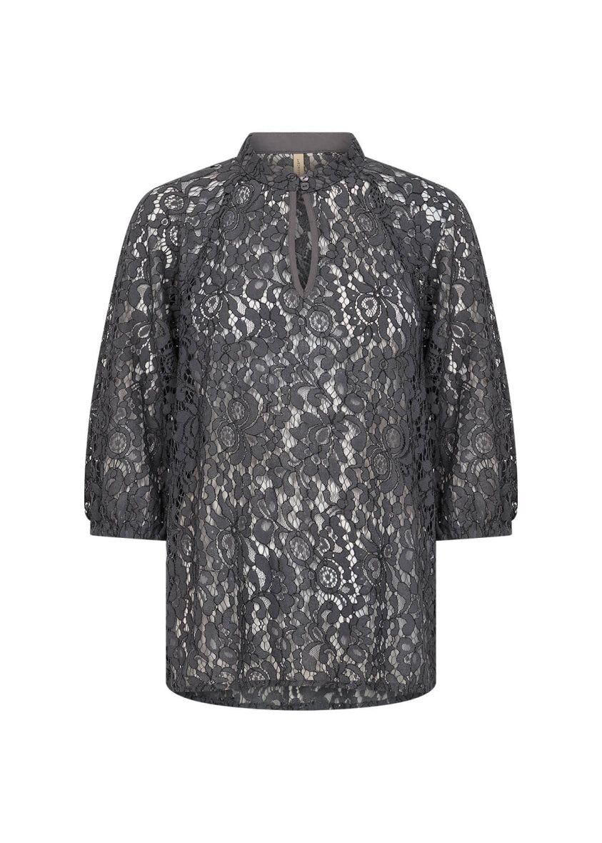 Soyaconcept bluse med det fineste blondemønster. Blusen er lavet i en grå kulør som nemt kan styles over en basiskjole, top eller bluse for at skabe et flot design. Blondeblusen er transparent og vi anbefaler derfor at iføre sig en top under.