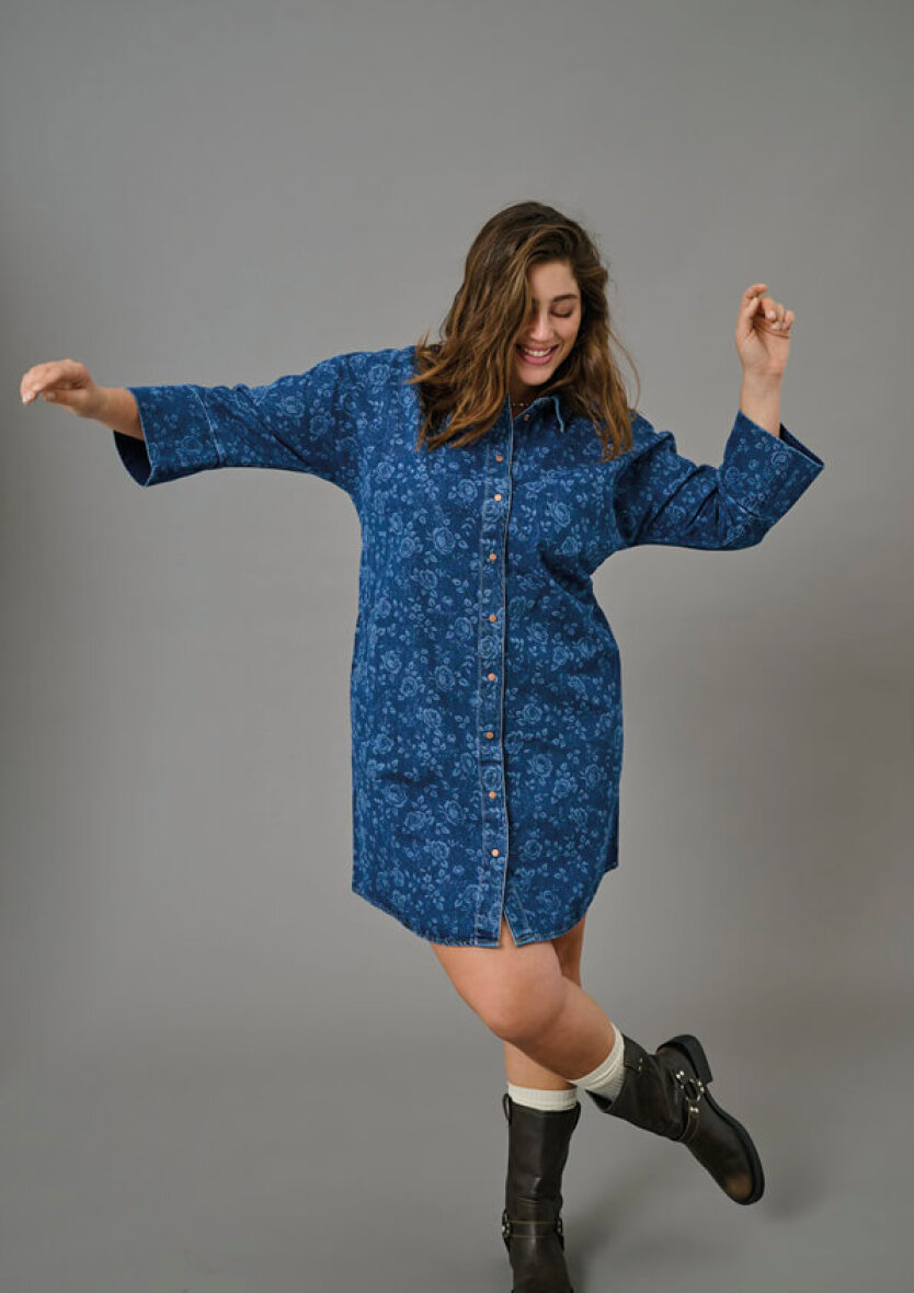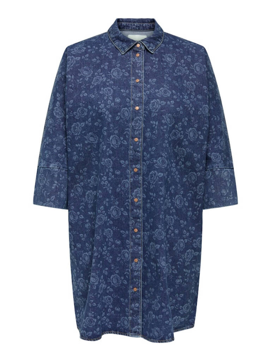 ONLY Carmakoma denimkjole i en skøn medium blå farve og et feminint rose mønster i lys denim, hvilket giver et feminint touch til den klassiske denim kjole.