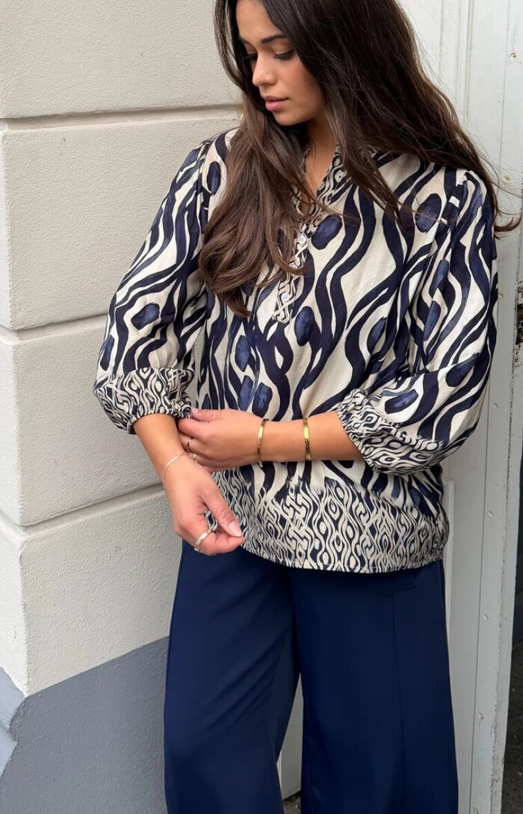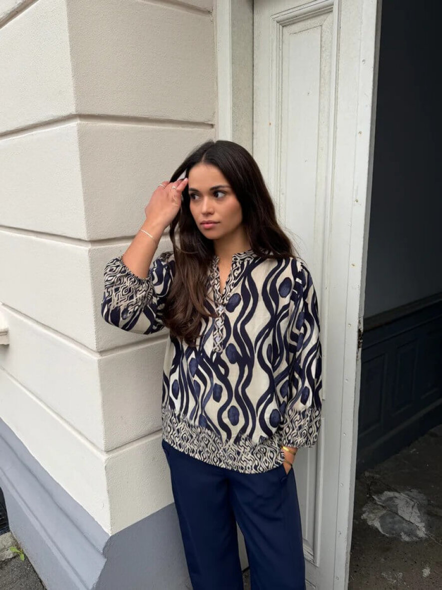 Det grafiske print i blå og beige base tilføjer karakter og kant til outfittet.