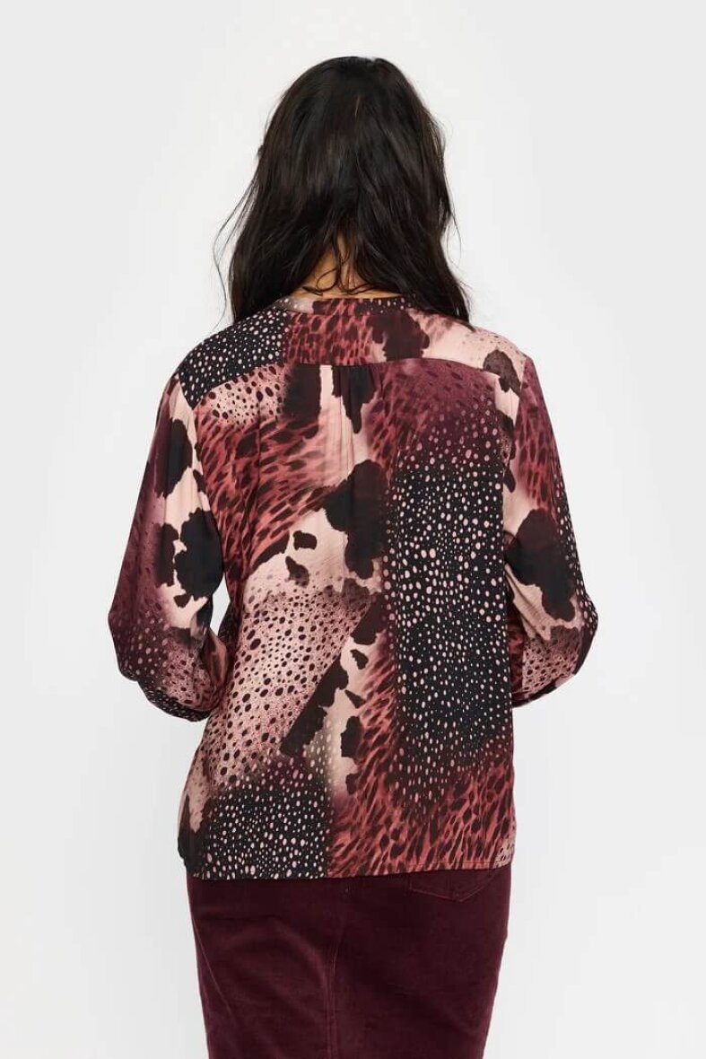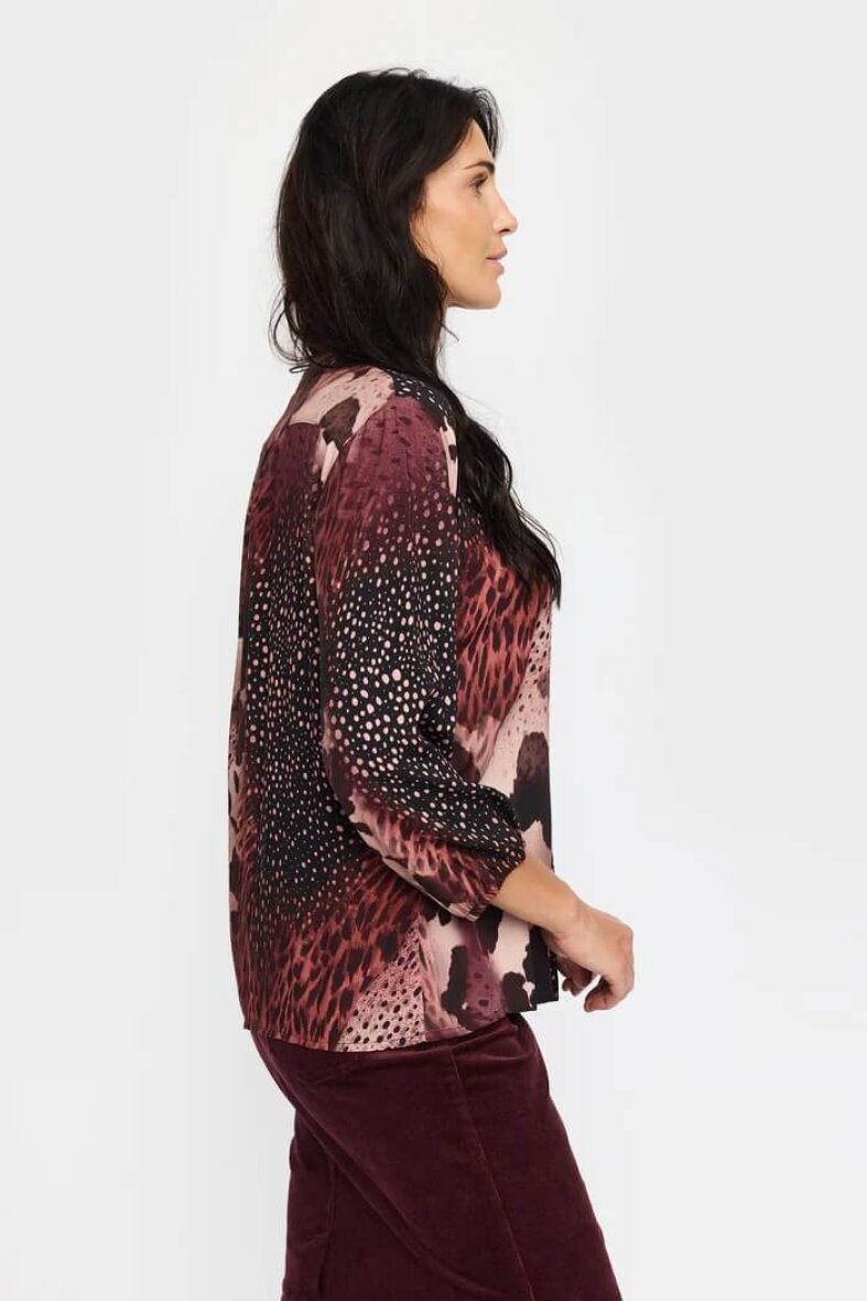 Blusen er med v-halsudskæring som fortsætter i stolpeluk og knapluk. Blusen er med trekvart lange ærmer, som afsluttes med elastikkant, som giver en flot poset effekt og afslappet udtryk.