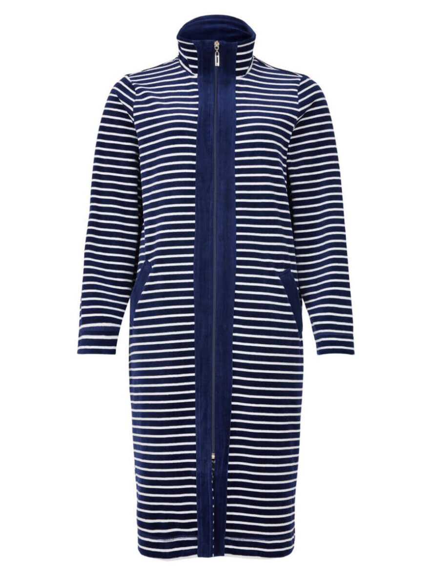 Brandtex morgenkåbe i et blå/hvis stribet design. Den lange morgenkåbe er lavet i en dejlig blød velour kvalitet udenpå.